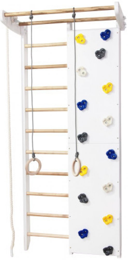 Dětská gymnastická sestava SportBaby Panda White 2–225/240 je ideální volbou pro domácí cvičení, zábavu i zdravý rozvoj motoriky dětí. Tato multifunkční dřevěná konstrukce kombinuje žebřiny (ribstole), hrazdu a lezeckou stěnu, a tím poskytuje široké možnosti využití v dětském pokoji, tělocvičně i domácí posilovně.
