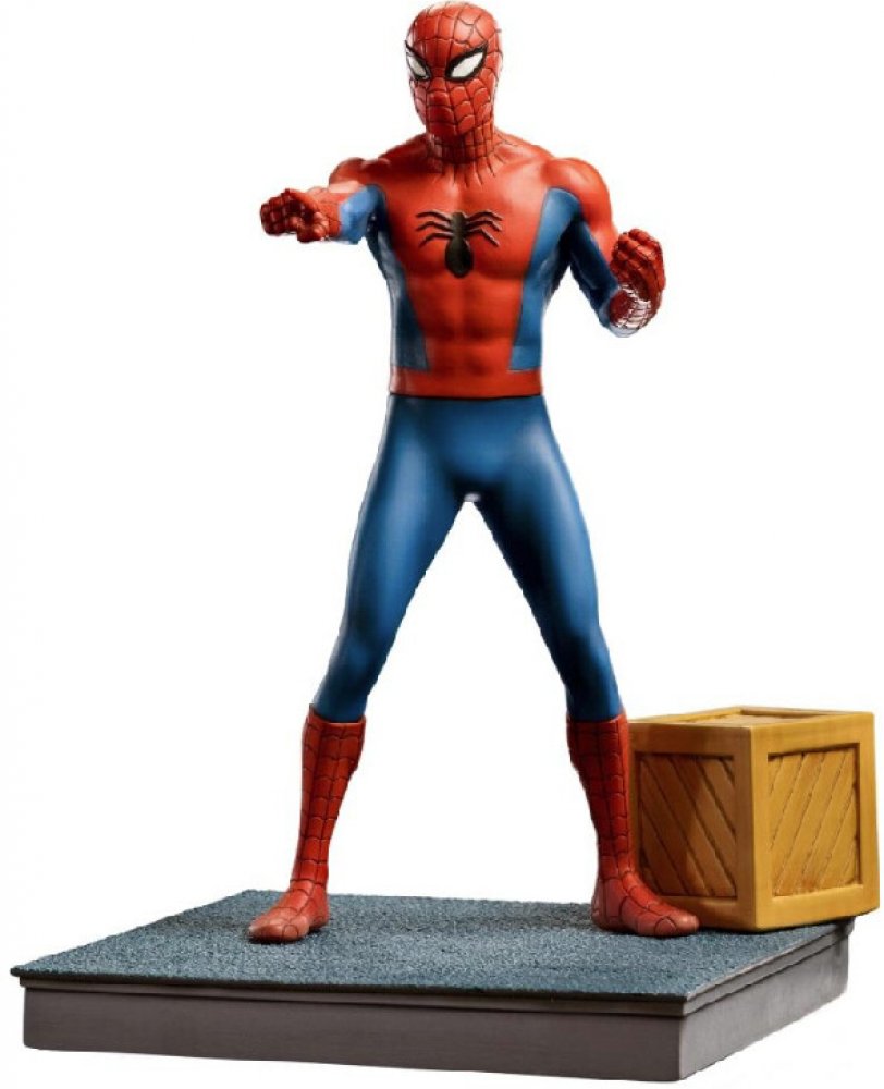 Animovaná série – Spider-Man - Art Scale 1/10", věrný do nejmenších detailů, i když některé chybí, vizuálu původního kresleného filmu milovaného nástěnného lezce, s hrdinou nad podstavcem vedle dřevěné bedny, odkazujícím na pozadí scenérie tohoto neobvyklého momentu v animaci. Animovaná série Spider-Man, produkovaná Grantray-Lawrence Animation v roce 1967, byla první adaptací superhrdiny Marvelu, která již měla úspěch v komiksech. Aby to byla nízkorozpočtová produkce, byl hrdinaův design prezentován s pavučiny z jeho obleku pouze na obličeji, rukou a nohou a většina animací byla znovu použita. Taková hospodárnost generovala několik vtipných chyb, jako když pavouci na obleku Petera Parkera měli pouze šest nohou, chyba byla opravena ve druhé sezóně. Ale možná ještě slavnější než samotná série byla ústřední znělka, kterou napsal držitel Oscara Paul Francis Webster a složil Bob Harris, její melodie a texty jsou dodnes zmiňovány v komiksech, hrách, seriálech a filmech. hrdina.