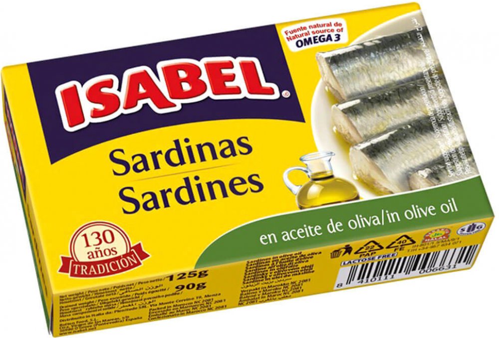 ZÁKONNÝ NÁZEV POTRAVINYSardinky v olivovém oleji - sterilovaná rybí konzervaSLOŽENÍsardinky (sardinka obecná - Sardina pilchardus), olivový olej 27%, jedlá sůlALERGENYRyby a výrobky z nich, MŮŽE OBSAHOVAT: Neuvádí seVÝŽIVOVÉ ÚDAJE/JEDNOTKAVýživové údaje na 100 g pevného podílu: Energetická hodnota 835 kJ/200 kcal; Tuky 12 g, z toho nasycené mastné kyseliny 2,4 g, mononenasycené mastné kyseliny 7,3 g, polynenasycené mastné kyseliny 2,2 g; Sacharidy 0,0 g, z toho cukry 0,0 g; Vláknina 0,0 g; Bílkoviny 23 g; Sůl 1,2 gVÝŽIVOVÉ ÚDAJE/PORCEneuvádí seHMOTNOST/OBJEMhmotnost: 125ghmotnost pevného podílu: 90gPŮVODMarokoVÝROBCEMARESI Foodbroker s.r.o., Hradešínská 1932/60, 101 00 Praha 10, Česká republikaVĚDECKÝ NÁZEV-LATINASardina pilchardusFAOFAO 34 Středovýchodní AtlantikZPŮSOB PRODUKCEodlov v mořiZPŮSOB ODLOVUkruhové zátahové sítě a čeřenyZPŮSOB ÚPRAVYkuchaná, bez hlavy a ocasu