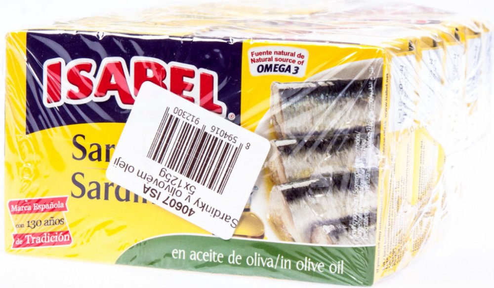 ZÁKONNÝ NÁZEV POTRAVINYSardinky v olivovém oleji - sterilovaná rybí konzervaSLOŽENÍsardinky (sardinka obecná - Sardina pilchardus), olivový olej 27%, jedlá sůlALERGENYRyby a výrobky z nich, MŮŽE OBSAHOVAT: Neuvádí seVÝŽIVOVÉ ÚDAJE/JEDNOTKAVýživové údaje na 100 g pevného podílu: Energetická hodnota 835 kJ/200 kcal; Tuky 12 g, z toho nasycené mastné kyseliny 2,4 g, mononenasycené mastné kyseliny 7,3...