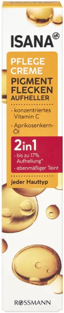 ISANA Krém pro zesvětlení pigmentových skvrn je lehký gelový krém s inovativní zesvětlující molekulou z polysacharidů, který prokazatelně redukuje viditelnost pigmentových skvrn až o 17 %. Pomáhá při nadměrné pigmentaci, která je často způsobena vlivy životního prostředí. Při pravidelném používání působí pleť rovnoměrněji a zářivěji.