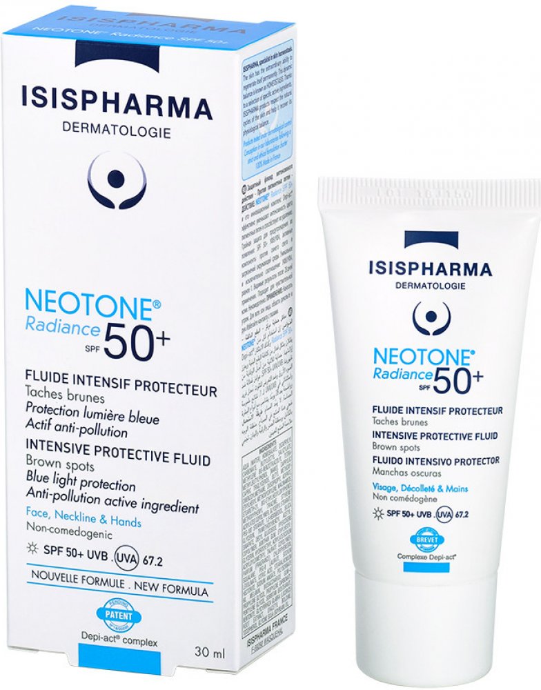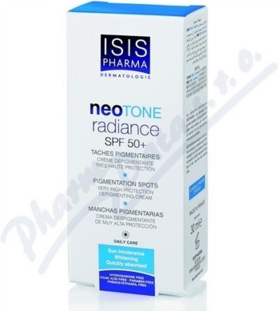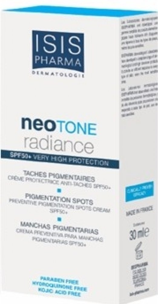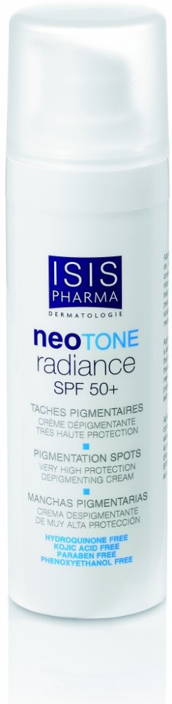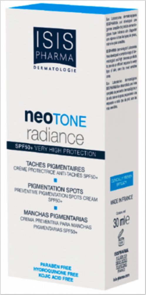 ISIS Neotone radiance SPF 50+ zabraňuje vzniku pigmentových skvrn a zároveň díky vysokému ochrannému faktoru i k jejich prevenci. Krém je vhodné používat každé ráno. Aplikujte jej v přiměřeném množství na čistou pleť obličeje. Krém se doporučuje používat dlouhodobě.