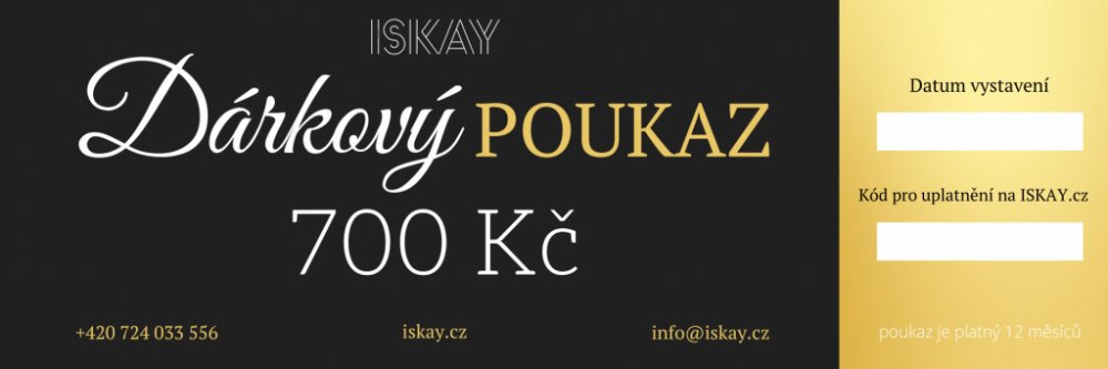 Vyberte si dárkový poukaz v hodnotě 300 Kč, 500 Kč, 700 Kč, 1 000 Kč, 1 500 Kč, 2 000 Kč nebo 3 000 Kč na nákup z ISKAY.cz!