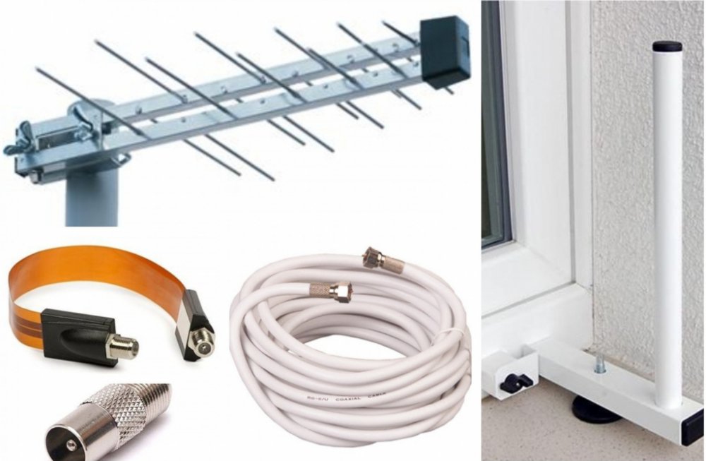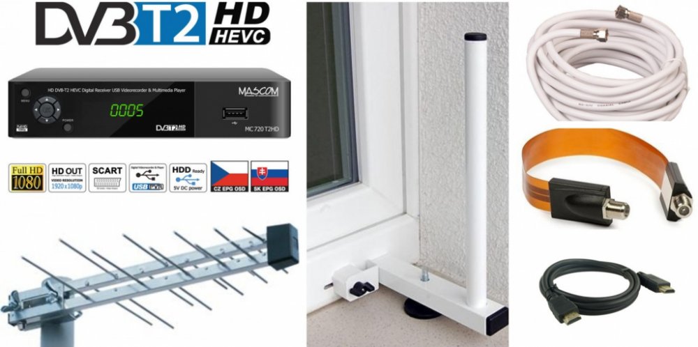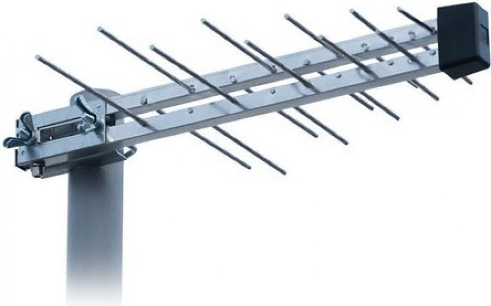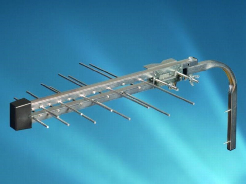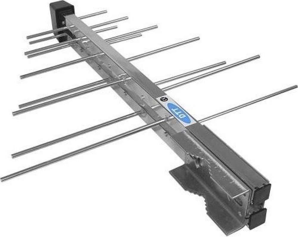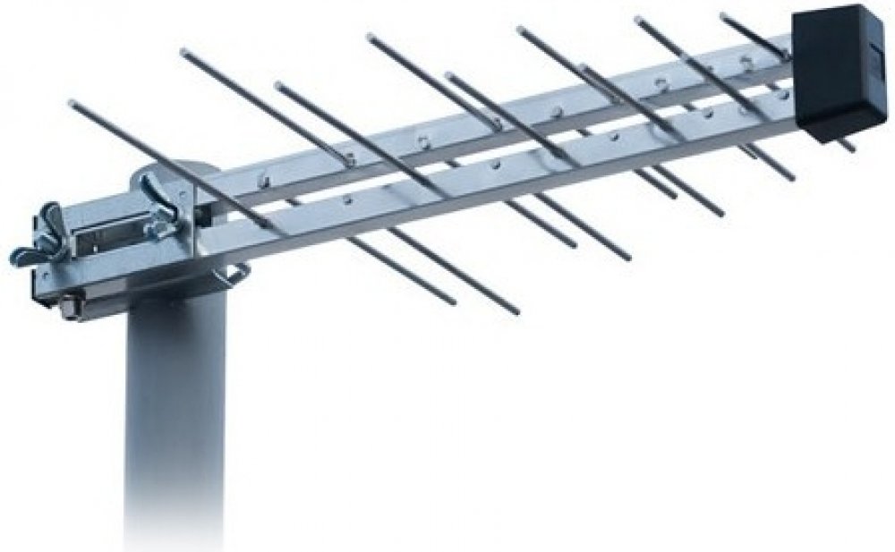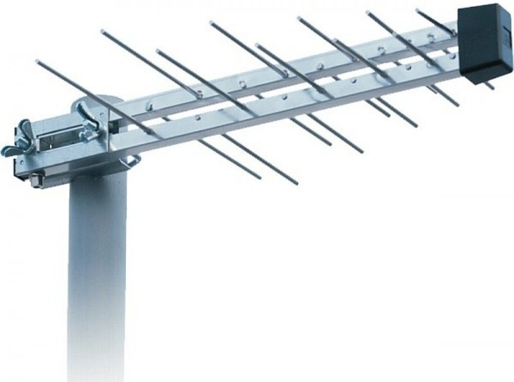 Logaritmická anténa UHF s F konektorem pro připojení kabelu a zesilovačem sloužící pro příjem DVB-T vysílání.