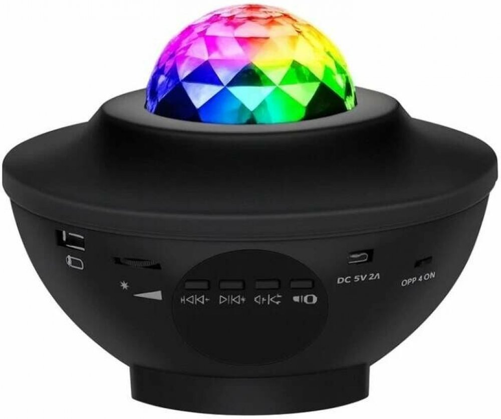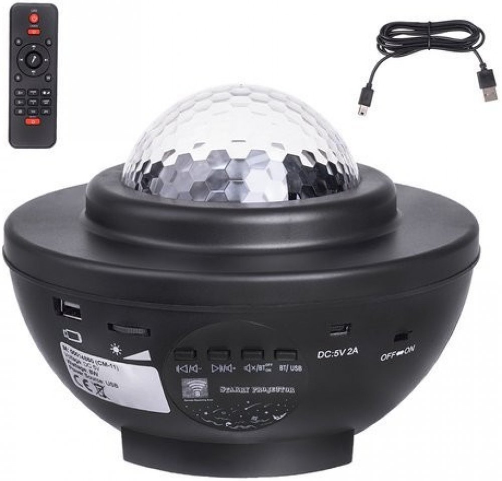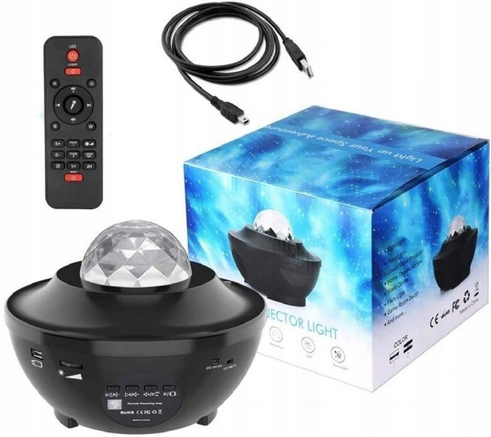 Multifunkční projektor funguje jako lampa, projektor a hudební přehrávač. Projektor pro noční osvětlení používá barvy modré, červené, zelené a bílé k vytvoření nádherné projekce. Světlo se promítá na strop a stěny místnosti, vytváří realistickou hvězdnou noční oblohu, poskytuje uvolňující atmosféru a nutí vás k procházce mezi hvězdami. Gadget stimuluje představivost dětí a pomáhá jim rychle a tiše usnout.