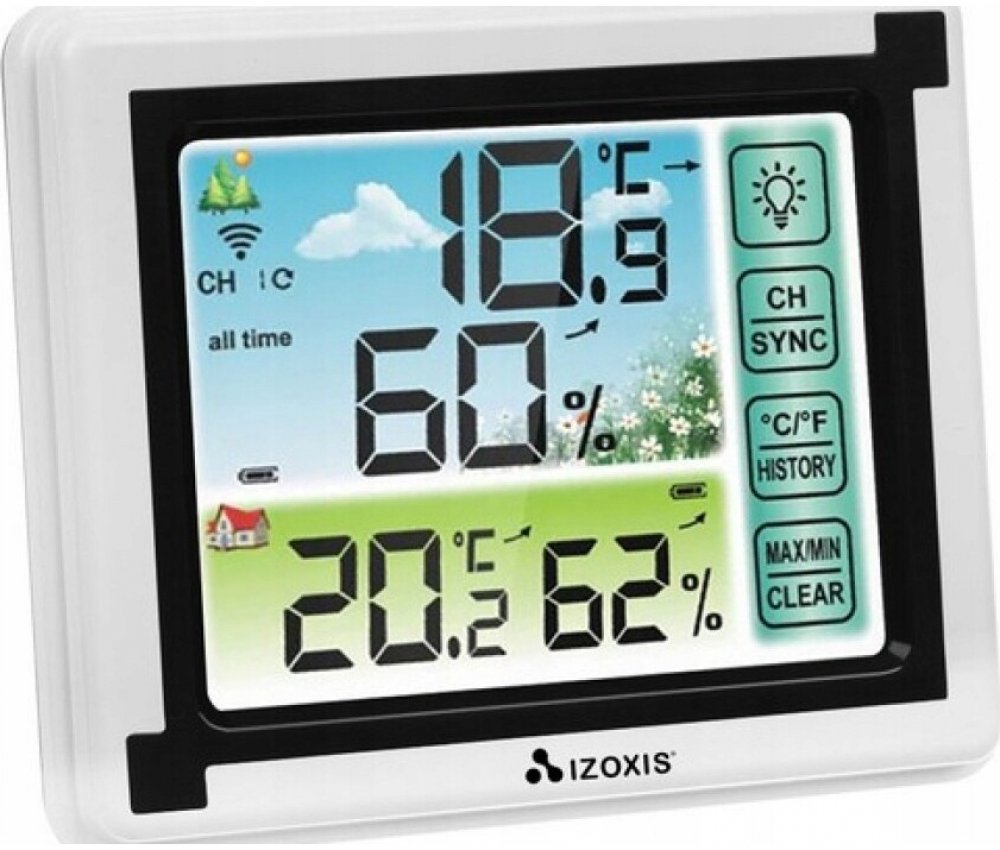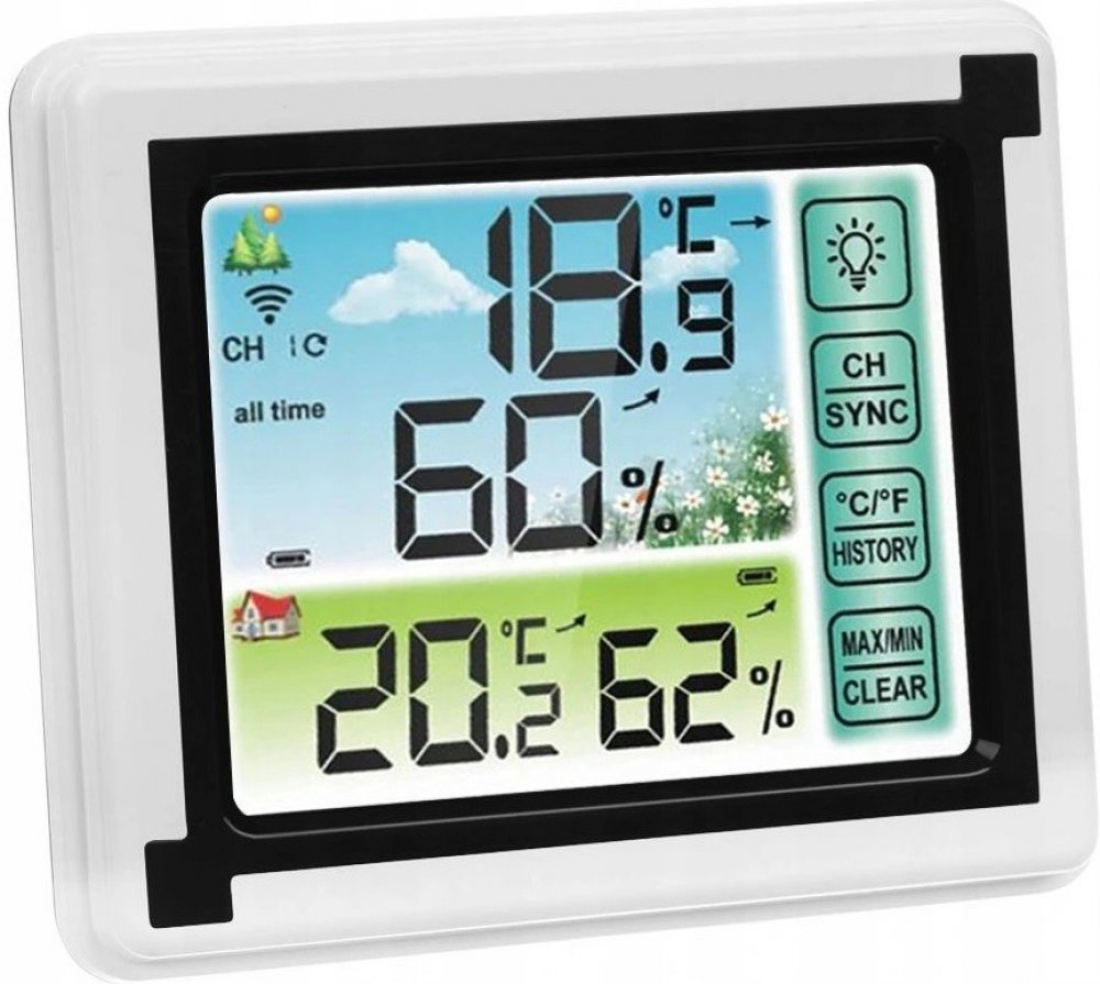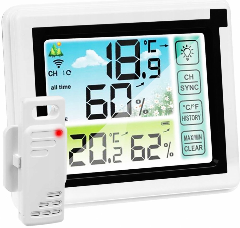- MULTIFUNKČNÍ – meteostanice má mnoho užitečných funkcí, včetně: pro měření maximální a minimální teploty, vnitřní a vnější teploty ve °C/°F a také měření vlhkosti vzduchu v %.