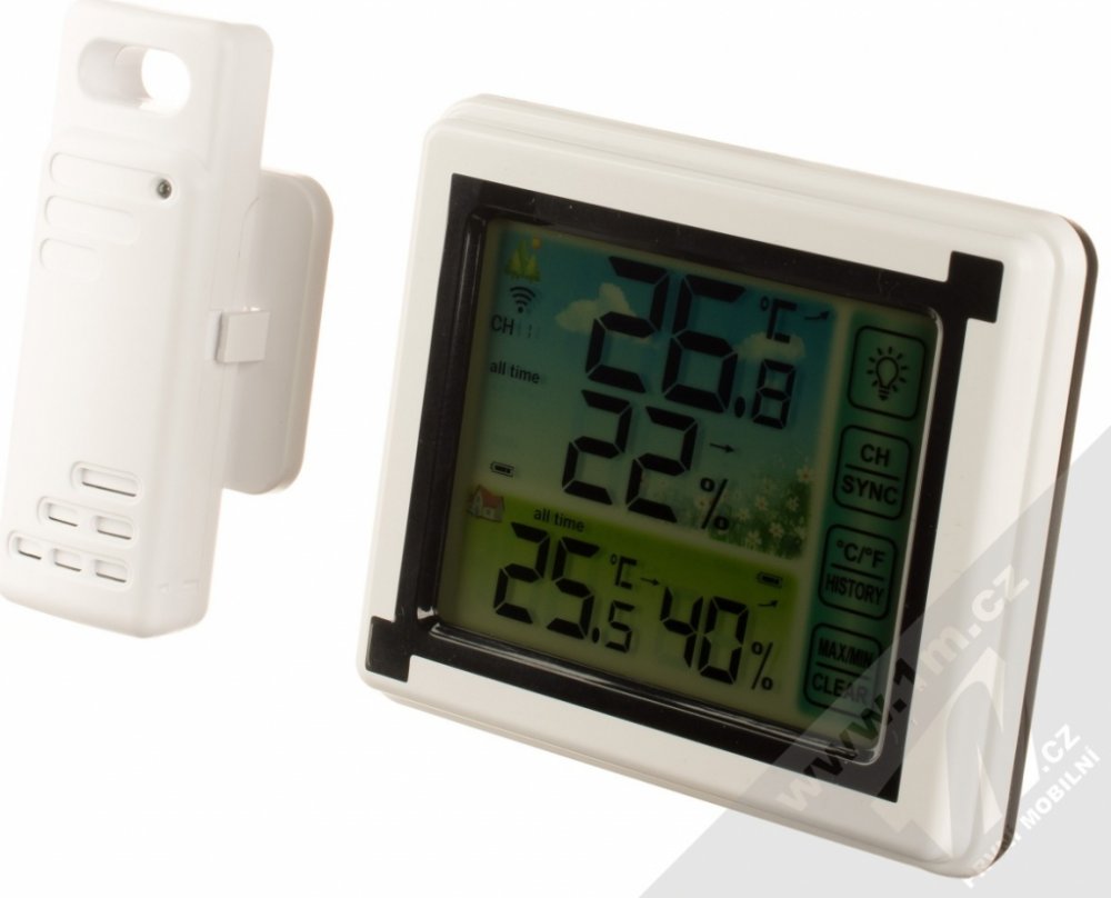 - SPECIFIKACE – barevný displej; 4 tlačítka: podsvícení, ch/sync, kroky/historie, max. min/jasný; zobrazuje: teplotu a vlhkost v domě a teplotu a vlhkost venku; rozsah vnitřní teploty: -20 °C až 70 °C / -4 °F až 158 °F; rozsah venkovní teploty: -40°C až 70°C / -40°F až 158°F; rozsah vlhkosti: 20%-95%; jednotka zobrazení teploty: volitelná °C / °F; obnovovací frekvence: každých 10 sekund; chyba: teplota + / - 1 °C; chyba: vlhkost + / - 5 %; dosah bezdrátového příjmu: 60 metrů; bezdrátová frekvence: 433MHz; rozměry: 11/9/2,5cm; hmotnost: 0,244 kg.