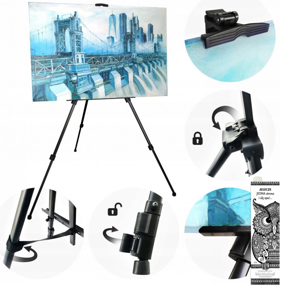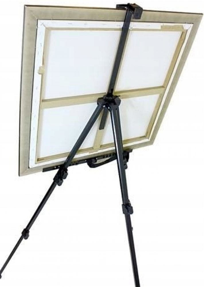 3-segmentové nastavitelné nožičky zajistí přesné nastavení výšky stojanu. Nastavitelná výška držáku obrazu - jedním pohybem svěrky jej lze upravit na výšku a tloušťku obrazu.