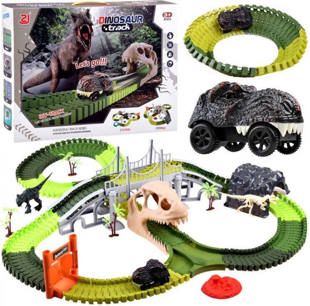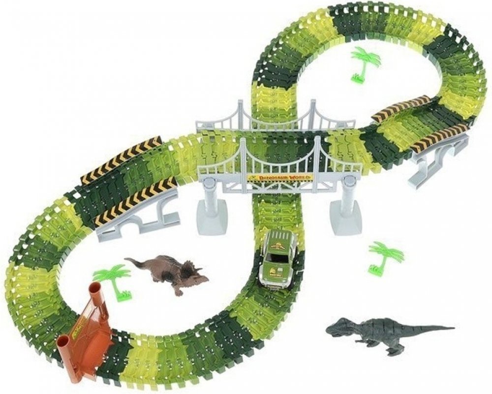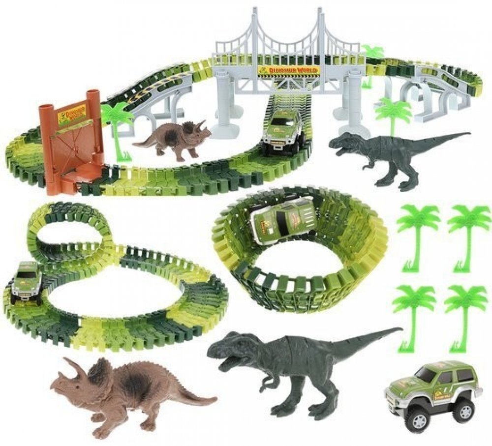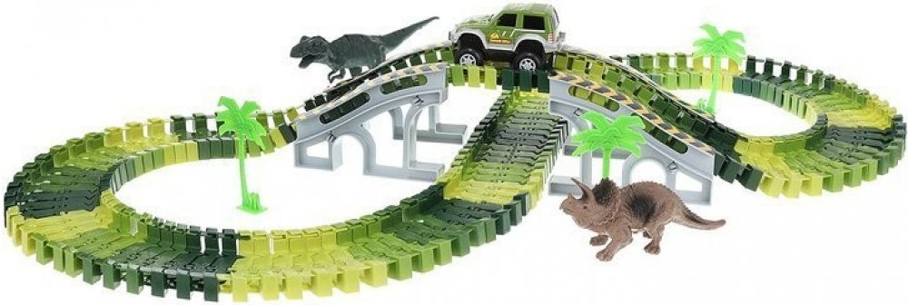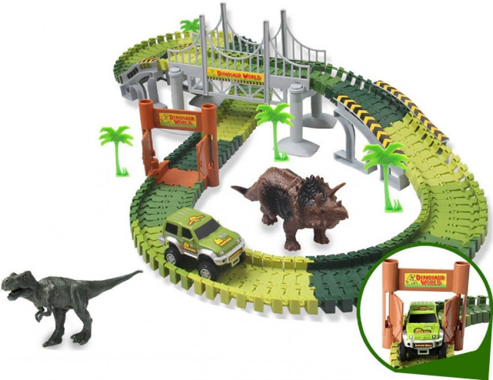 Velká závodní dráha s dráhou pro terénní auto je hračkou snů pro každé dítě fascinované různými vozidly. Umožňuje zajímavě trávit čas zejména za nepříznivého počasí. Flexibilita dráhy umožňuje uspořádat několik menších, např. smyček, nebo jednu dlouhou dráhu . Atraktivitu hračky zvyšují doplňky, díky kterým se dítě bude cítit jako návštěvník skutečného dinoparku.
