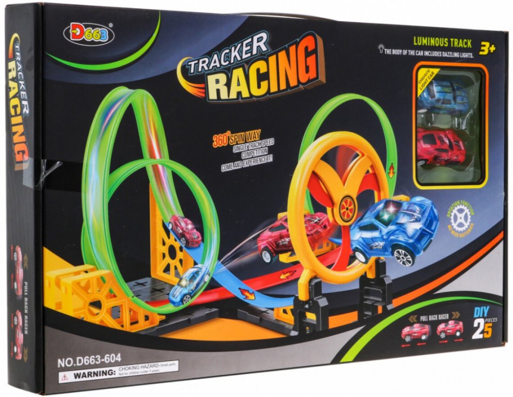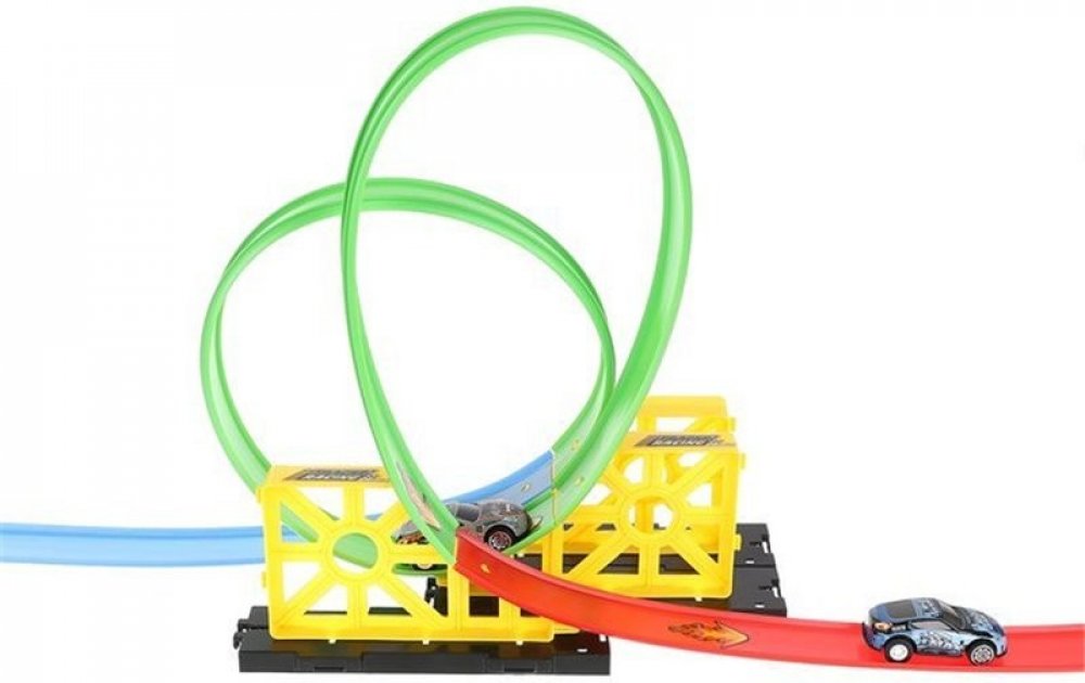 Závodní dráha se dvěma auty, smyčkami a pohyblivým okrajem, přes který můžete skočit, je návrhem pro děti od 3 let. Vozy jsou napájeny bateriemi 3 x AG13, které jsou součástí balení, pracují na pohonu a mají LED osvětlení. Trať se snadno uspořádá, nezabírá mnoho místa, snadno se ovládá. Jediné, co musíte udělat, je urychlit auto na trati, které pak překoná tři smyčky a přeskočí zábradlí. Madlo je pohyblivé, což znamená, že není vždy možné, aby se přes něj auto dostalo. Tato zábava se nikdy nenudí a dává spoustu radosti.