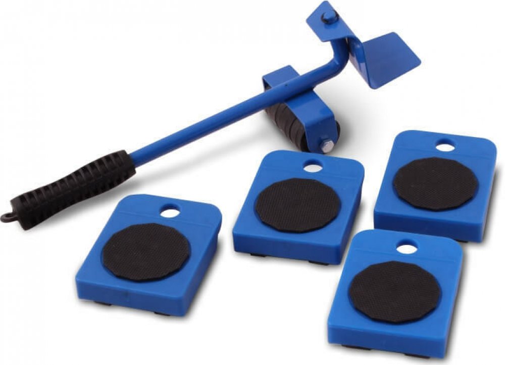 Sada stěhovacích koleček a zvedací tyče pro usnadnění stěhování těžkých břemen.