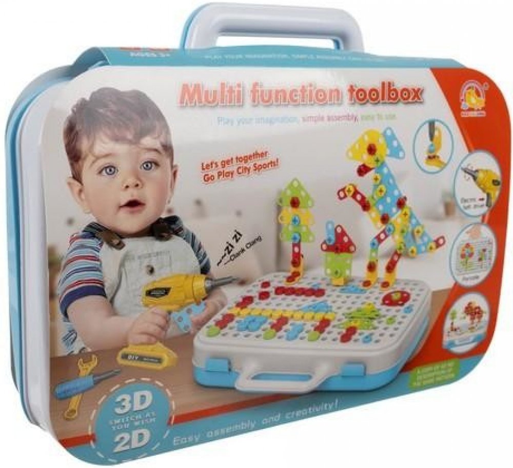 ZÁBAVA - kreativní způsob, jak se skvěle bavit se svými rodiči. Zábavou je uspořádat obrázky / vzory pomocí mnoha různých tvarů (obdélník, čtverec, kruh, trojúhelník). Vybrané prvky jsou přišroubovány šroubovákem k základně kufru, na které jsou speciální otvory.