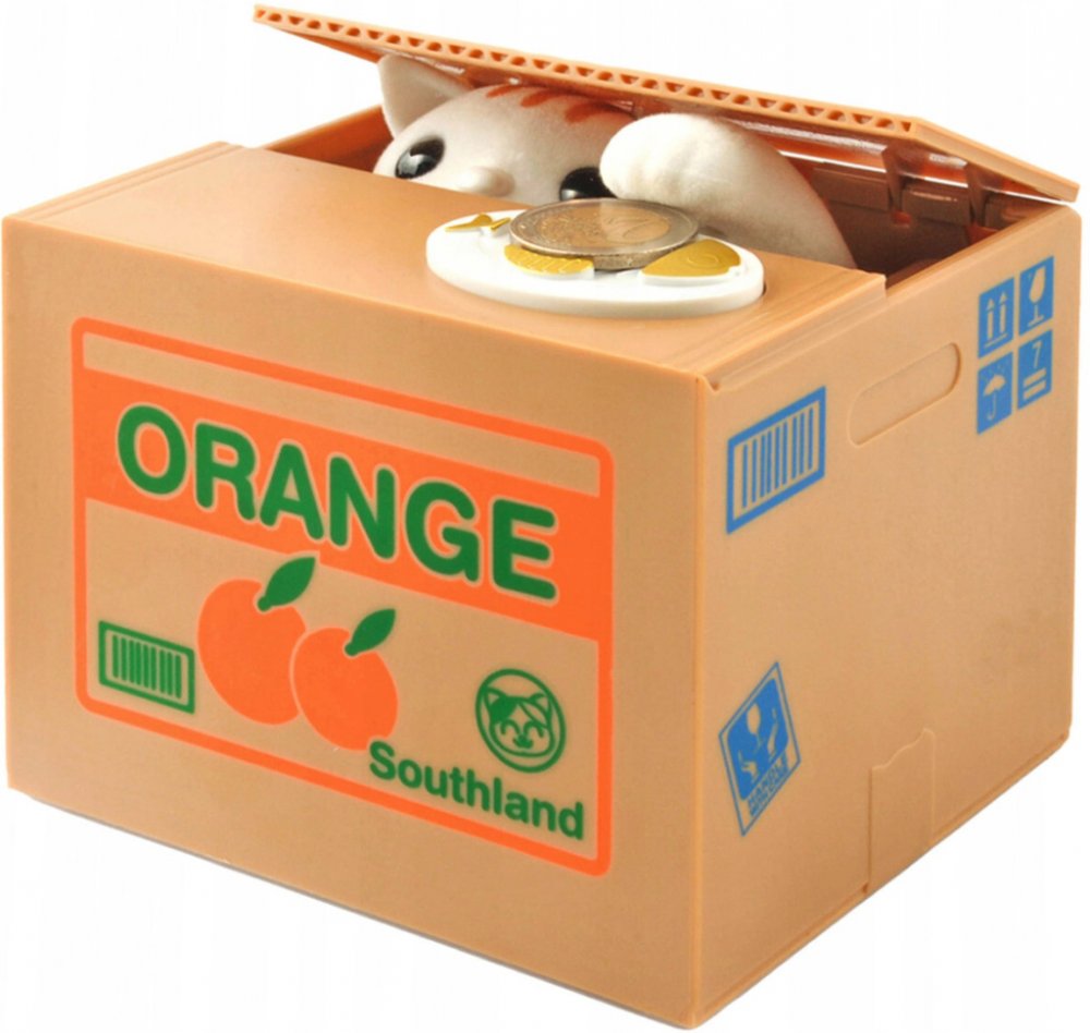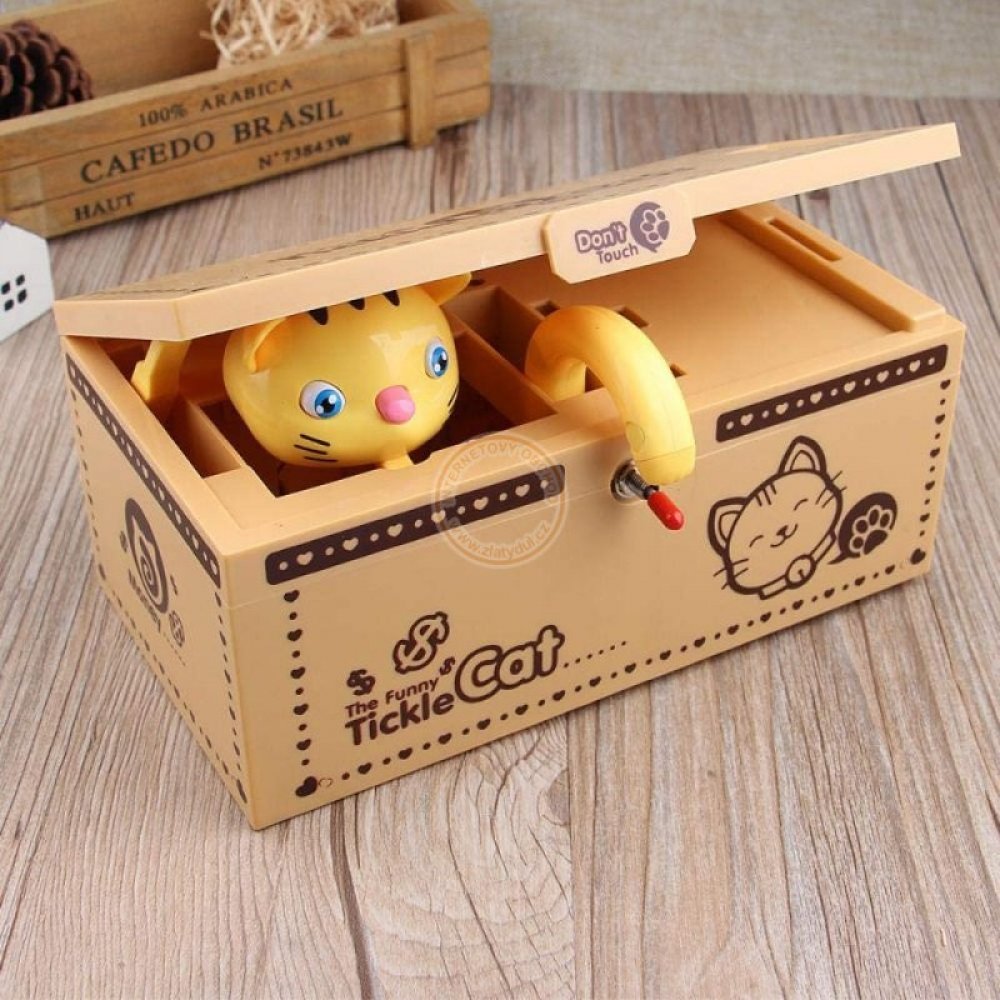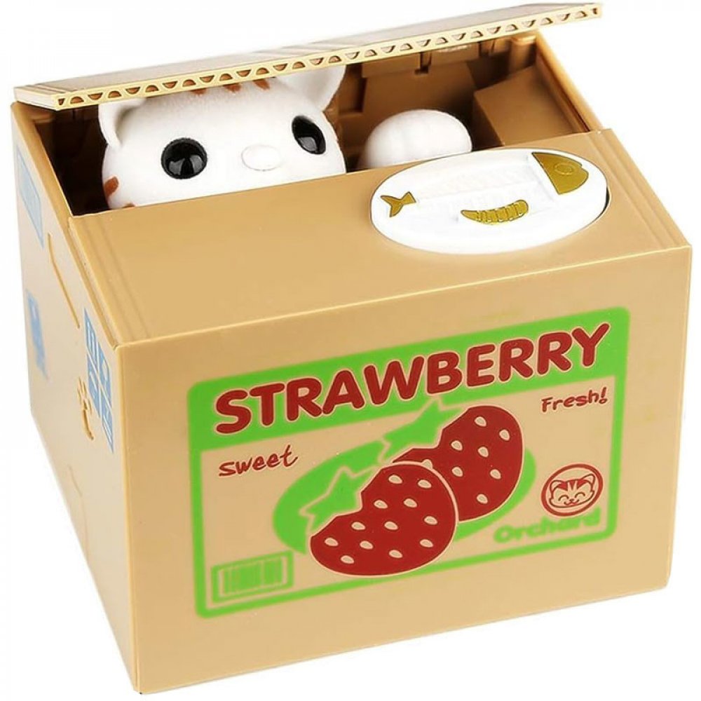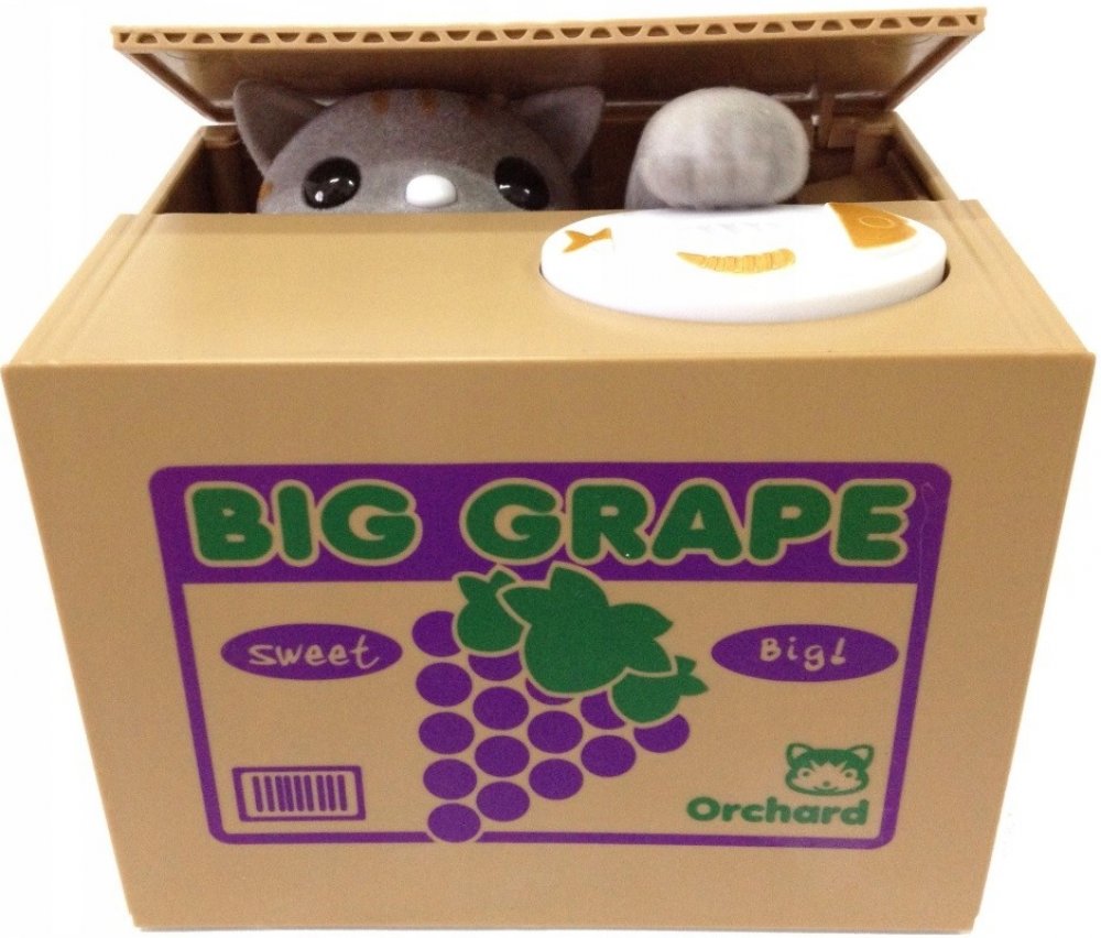 Automatická interaktivní pokladnička, ve kterém se kotě schovává v krabičce, tlapkou sebere minci ležící na jeho okraji, přičemž vydává zvuky mumlání a pohybu. Pokladnička učí, jak ušetřit peníze a poskytuje spoustu zábavy. Stačí vložit minci na určené místo, lehce stisknout tlačítko, pak se víko krabice zvedne, zevnitř se objeví kočička a sáhne po minci s tlapou. V tomto okamžiku spadne mince dovnitř krabice. Mince mohou být odstraněny otvorem zakrytým zátkou pod pokladničkou.
