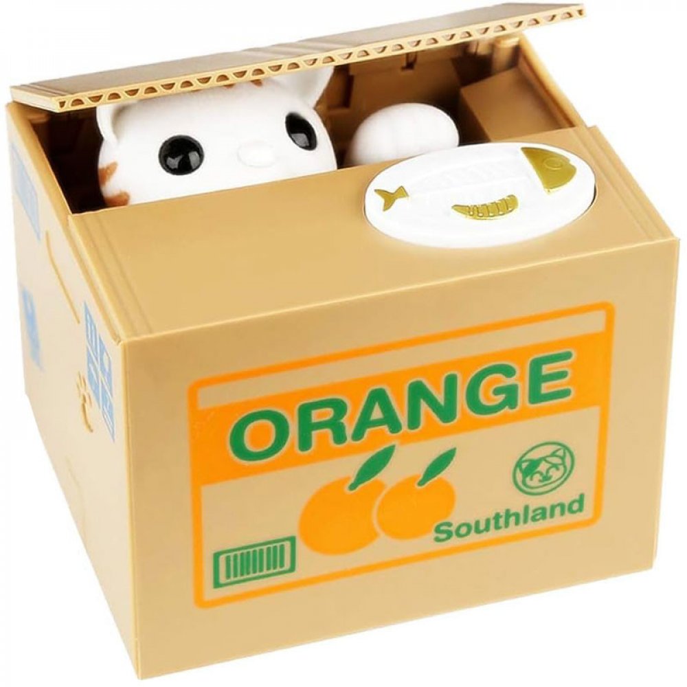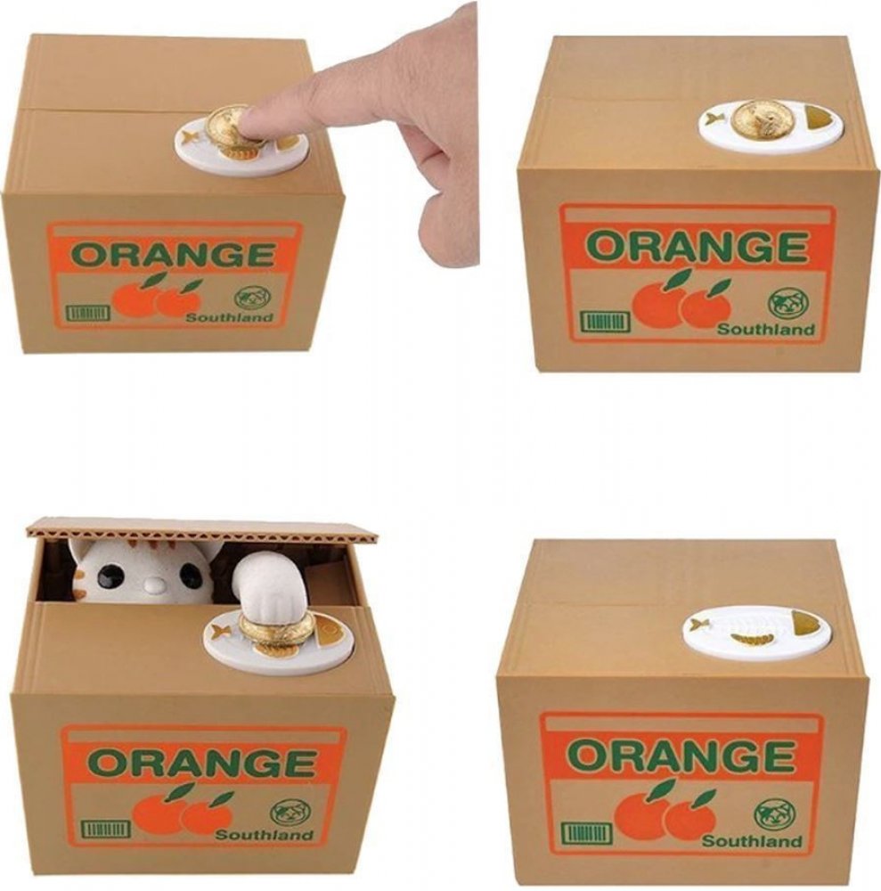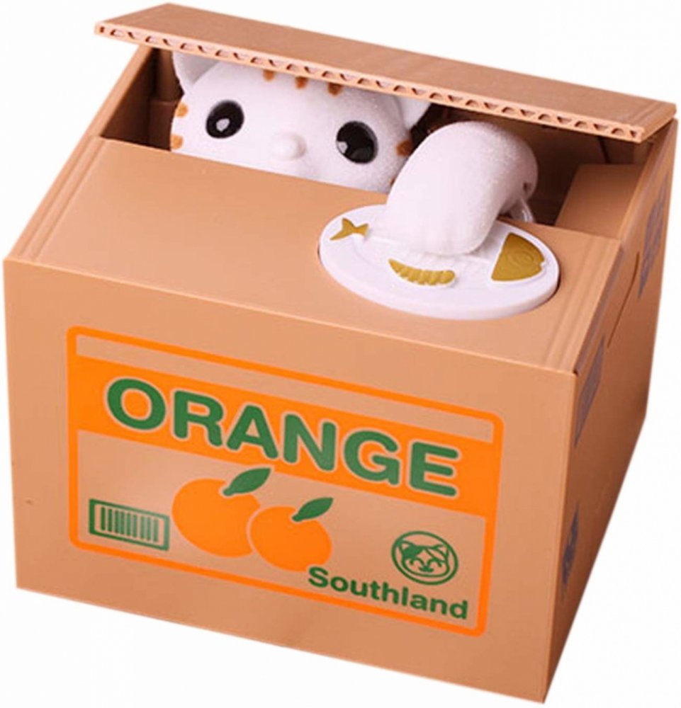 Automatická interaktivní pokladnička, ve kterém se kotě schovává v krabičce, tlapkou sebere minci ležící na jeho okraji, přičemž vydává zvuky mumlání a pohybu. Pokladnička učí, jak ušetřit peníze a poskytuje spoustu zábavy. Stačí vložit minci na určené místo, lehce stisknout tlačítko, pak se víko krabice zvedne, zevnitř se objeví kočička a sáhne po minci s tlapou. V tomto okamžiku spadne mince dovnitř krabice. Mince mohou být odstraněny otvorem zakrytým zátkou pod pokladničkou.