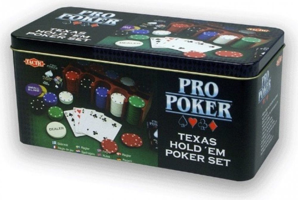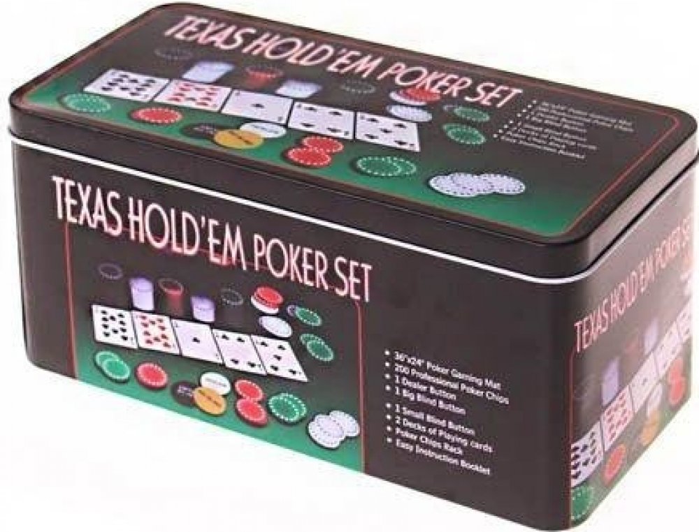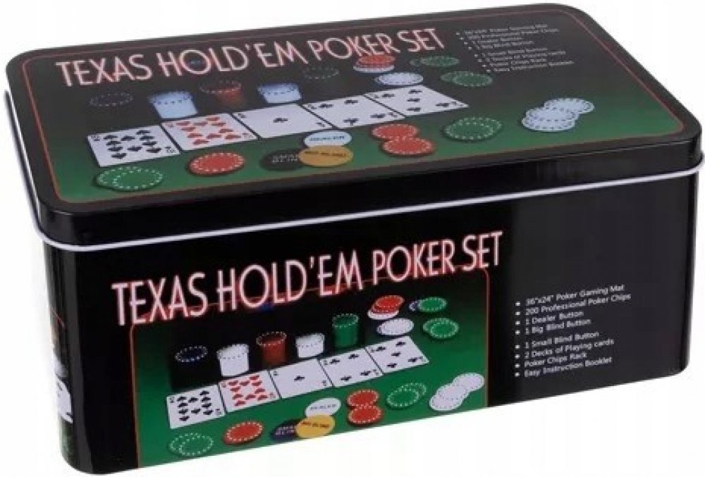 * Hliníková krabička * 200 kusů vysoce kvalitních, neotírajících se herních žetonů: 1€, 5€,10€, 25€, 50€ * Filcová herní podložka na karetní hry. * Dealer button (speciální žeton označující hráče, který by měl rozdávat), Small Blind button, Big blind button. * 2 balíčky potahovaných hracích karet