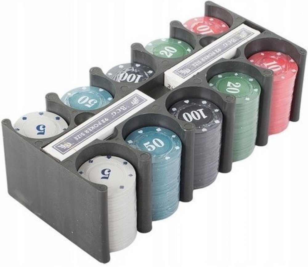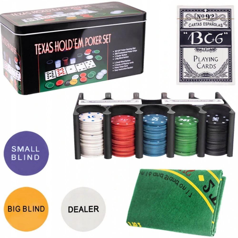 2 balíčky karet, 200 žetonů s nominály, Dealer button, Small Blind, Big blind, podložka na poker, Vhodný ke hře poker i dalším, například kostky, ruleta nebo black jack. Žetony jsou patřičně těžké, vyrobené jako ty v kasinu z vhodné umělé hmoty. Žetony jsou vhodné ke krupiérským ukázkám, ke hře poker texas holdem, na ruletu a další.