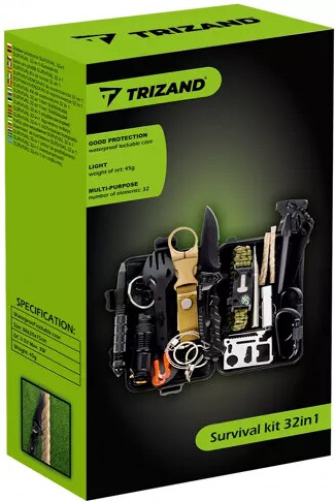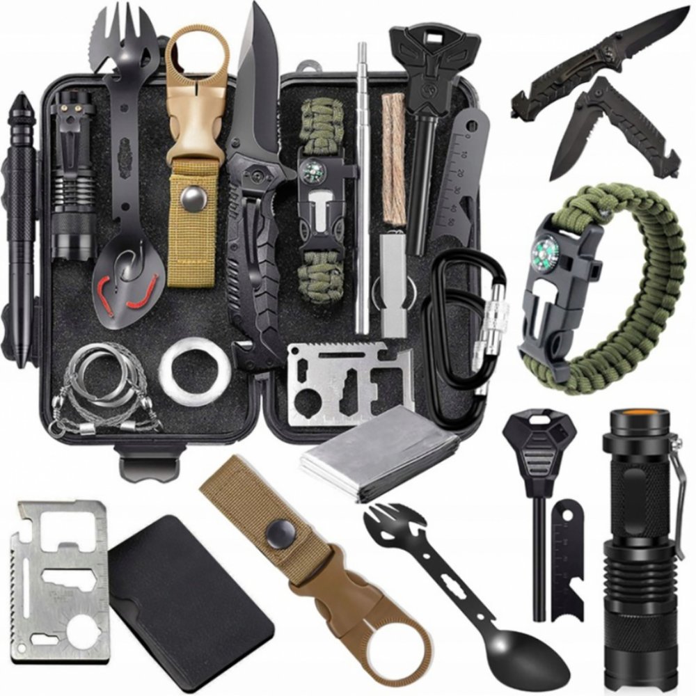 32 v 1 - sada obsahuje: strunová pila cca 60 cm dlouhá, zavírací nůž s pilou a řezačkou struny , taktické pero, karta přežití 11 v 1, zapalovač ohně s hořčíkovou tyčí a tác na sekání s cm stupnicí a otvírákem na láhve, svítilna - napájená AA baterií (baterie nejsou součástí balení), tepelná přikrývka 130x210 cm, uzamykatelná úložný kontejner, držák na láhev na opasek, paracordový pásek - cca 350 cm paracordu s kompasem, píšťalkou a podpalovačem - vše ve formě pásku, silikonová návnada 2 ks + vlasec + 2 háčky, náležitosti - lžíce s vidličkou a otvírákem na láhve + nůž, skládací plamenec, zapalovací struna 2 ks, karabina 2 ks Jedná se o velmi velkou sadu, která vám umožní přežít ve velmi obtížných podmínkách.