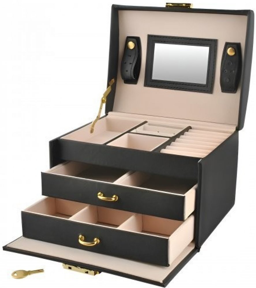 Šperkovnice ISO je ideální volbou pro bezpečné uložení vašich cenných klenotů a doplňků. Díky použití syntetické kůže má sofistikovaný vzhled a snadno se udržuje. V praktickém zrcátku hned zhodnotíte, který šperk nejlépe doplní váš celkový vzhled. Uvnitř se nachází 3 patra, tudíž budete mít prostor, kam umístíte všechny prstýnky, náramky i náhrdelníky. Šperky si můžete přehledně uložit do dvou přihrádek. Hlavní přednosti šperkovnice ISO 6348 Šperkovnice se zrcadlem na klíč černá Šperkovnice ISO je perfektním řešením pro uložení vašich cenností Je zhotovena ze syntetické kůže Šperkovnice se zrcadlem umožní překontrolování vizáže Uvnitř se nachází 3 patra Je vybavena rovněž 2 zásuvkami Šperkovnice ISO má rozměry 13,5 × 17,5 × 13,8 cm (vך×h) Její barva je černá