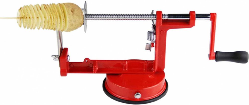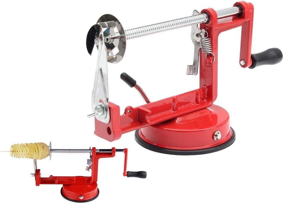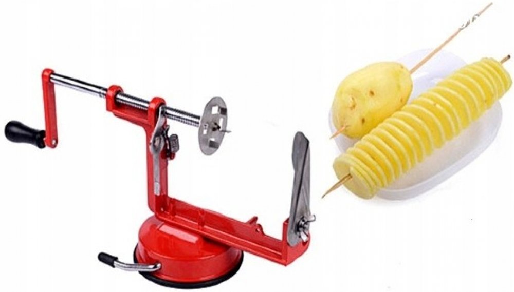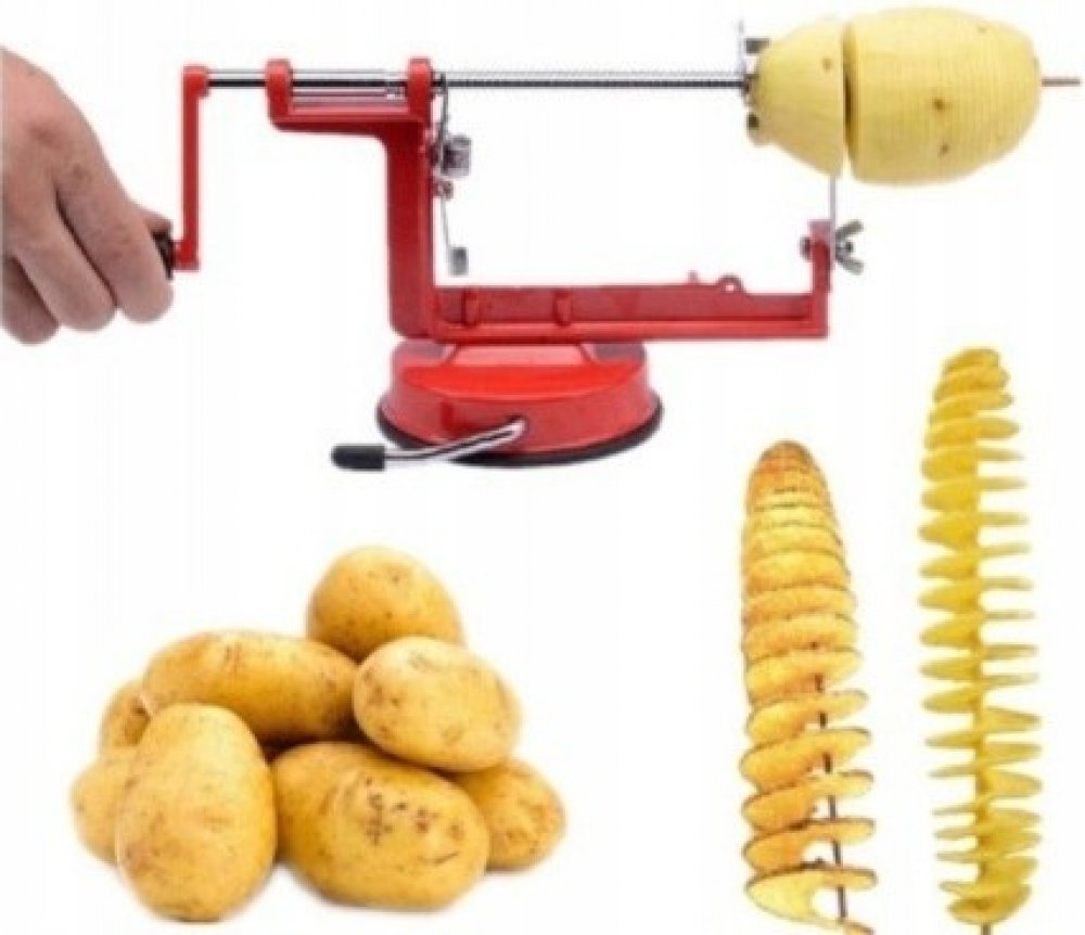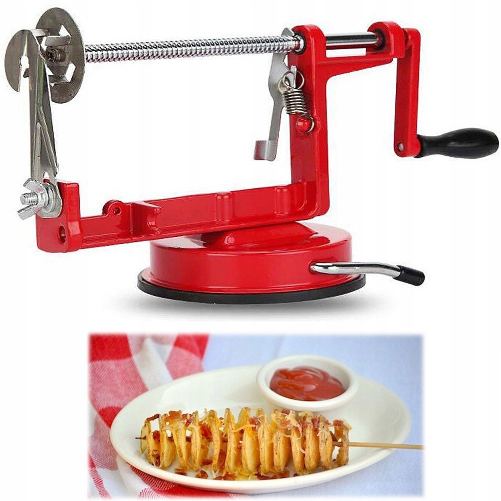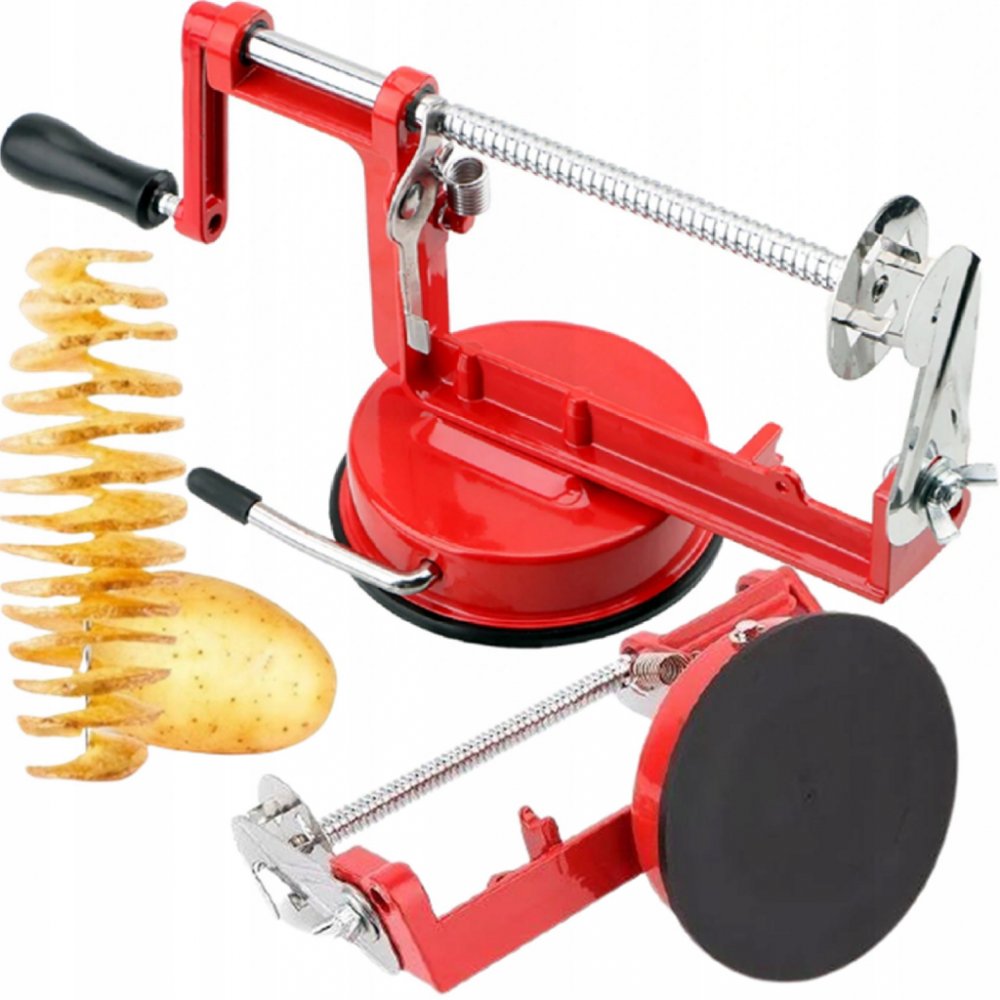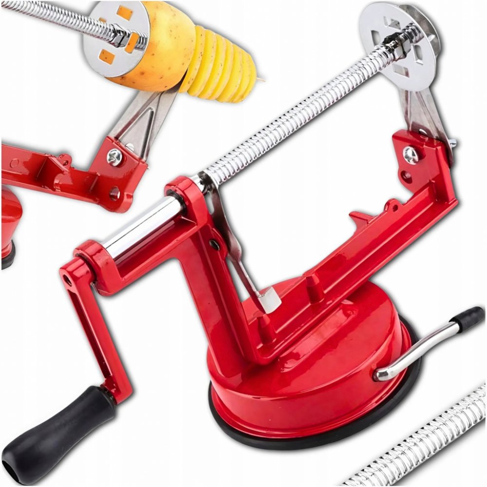 Spirálový kráječ brambor a zeleniny | červený Ruční stroj na výrobu točených hranolek je ideálním a velmi užitečným zařízením v každé kuchyni. Díky němu uděláte chutné a originální jídlo. Ruční kráječ vám umožní rychle a snadno nakrájet brambory na pokroucené hranolky. Jde o speciální nakrájené brambory na špejle, které se pak smaží na…