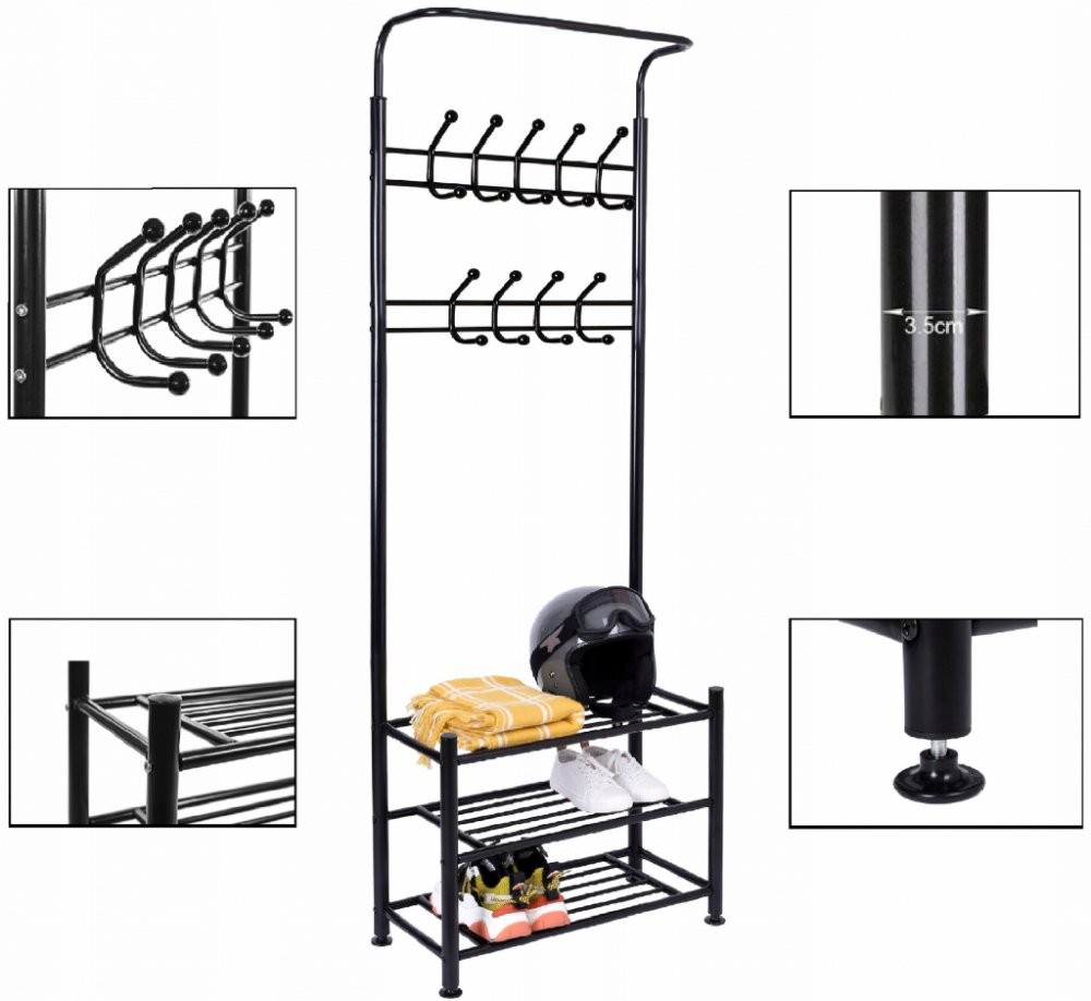 Nabízený robustní věšák je doplňkem, který nepochybně stojí za to mít doma. Je mimořádně funkční a velmi prostorný - pojme velkou část vašeho šatníku a přitom vám doma zabere jen velmi málo místa. Umožňuje tak rychlý přístup k oblečení a dalším věcem. Stojanový věšák je mimořádně praktické řešení. Snadno se vejde do každé ložnice, kde může sloužit jako věšák na župany, ale také na košile a další oblečení. Na druhou stranu, umístěný v předsíni, vám umožní ukládat bundy, kabáty, boty a mnoho dalších věcí, včetně batohů. FUNKČNOST - věšák na oblečení je funkční a mimořádně prostorný - pojme velkou část vašeho šatníku a přitom zabere v domácnosti jen velmi málo místa. PRAKTICKÝ - věšák je mimořádně praktický. Snadno se vejde do ložnice, kde ho lze použít jako věšák na župany a také košile. Na druhou stranu, umístěný v předsíni, vám umožní uložit bundy, kabáty, boty a mnoho dalších užitečných věcí, které chcete mít vždy "po ruce". SKLADOVÁNÍ - věšák je vybaven třemi dalšími přihrádkami, které mohou sloužit mnoha funkcím - můžete do nich uložit boty i tašky a batohy. STABILNÍ -věšák na oblečení je vyroben z vysoce kvalitního materiálu, díky čemuž má pevnou konstrukci, díky níž je stabilní a nepřevrátí se, ani když je na něm umístěno velké množství oblečení. SPECIFIKACE - tři věšáky na boty; 18 háčků; rozměry: 192/29/65 cm; hmotnost: 6,35 kg.