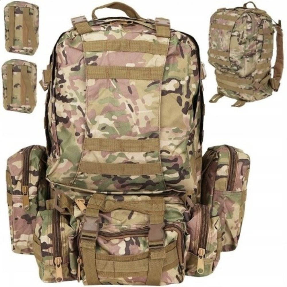 45l batoh se skládá ze 2 přihrádek. Uvnitř hlavní přihrádka existuje další oddíl, druhá komora uvnitř má kapsu s našitou síťovinou. Navíc batoh má 3 odnímatelné brašny , z nichž jedna je ledvinka. Výrobek je vyroben z odolného, voděodolného materiálu, odolného proti roztržení a oděru. Obě komory se zapínají na dvojitý zip, díky kterému je zavírání i otevírání plynulé. Zipy jsou kryté, takže nehrozí vniknutí vody do batohu.Batoh má nosný systém, který tvoří profilované ramenní popruhy s rychloupínacími přezkami, jde o praktické řešení a slouží k okamžitému shození batohu. Zodpovědnost za stabilní převod plynulé nastavení profilovaných ramenních popruhů, hrudního pásu a bederního pásu, který lze odepnout - pás umožňuje ulevit páteři a ramenům při nošení batohu - veškerá váha je soustředěna na boky. Používají se na přední straně batohu, stejně jako na ramenních popruzích a bočních brašnách PALS pásky, které umožňují připevnění MOLLE vybavení - to umožňuje instalaci dalších kapes.Boční stěny a horní část batohu mají 2 nastavitelné popruhy zapínané na přezku - slouží ke stlačení batohu. Zkrácení popruhů batohu umožňuje jeho zploštění, například když je hlavní komora prakticky prázdná a plní se jen menší kapsy. Batoh má také odnímatelnou ledvinku, která je uchycena v MOLLE systému. Umožňuje jej připevnit na pásek u kalhot. Součástí sady je i pásek, který vám umožní nasadit a nosit jako typickou ledvinku. V horní části má madlo, které vám umožní nosit i jako tašku. Ledvina v hlavní komoře má síťovanou přepážku. Vpředu je dále přihrádka se 3 kapsami a také 2 boční kapsy na zip. Může být také použit jako toaletní taška při kempování.