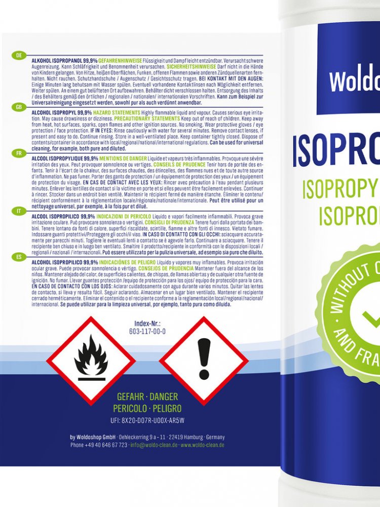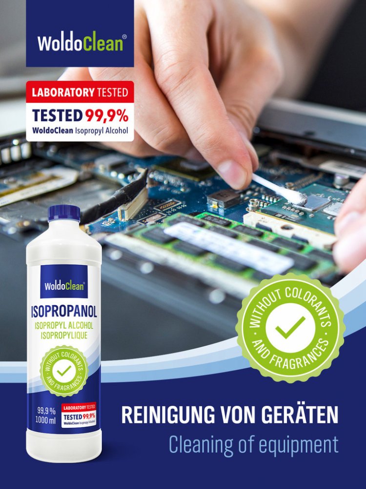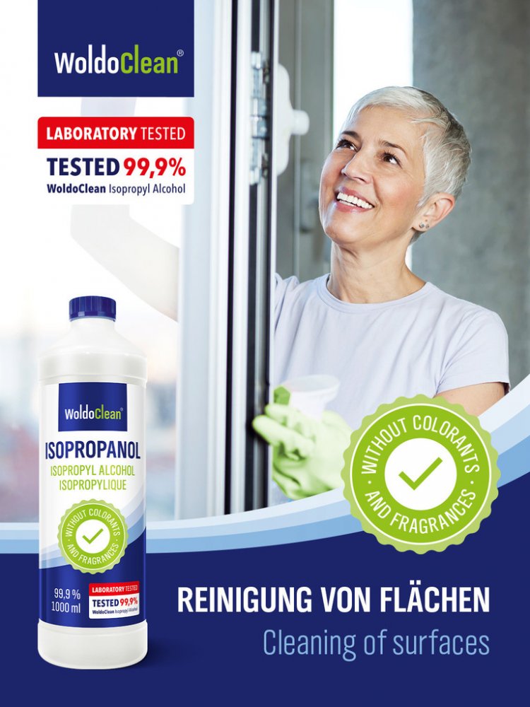 - WoldoClean isopropanol je ideální pro řadu aplikací v domácnosti, lékařství, průmyslu nebo dílnách.
