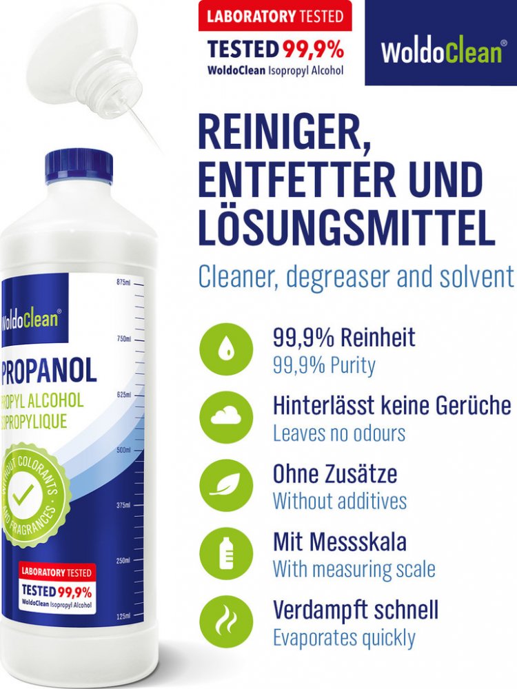 Isopropanol jako čistící alkohol, odmašťovač pro čištění v domácnosti, kuchyni, kosmetice a hobby. Izopropanol (IPA) jako rozpouštědlo nebo ředidlo pro mazací tuky, pryskyřice, barvy a inkoust, podobné etylalkoholu. Vhodné pro téměř všechny povrchové materiá...