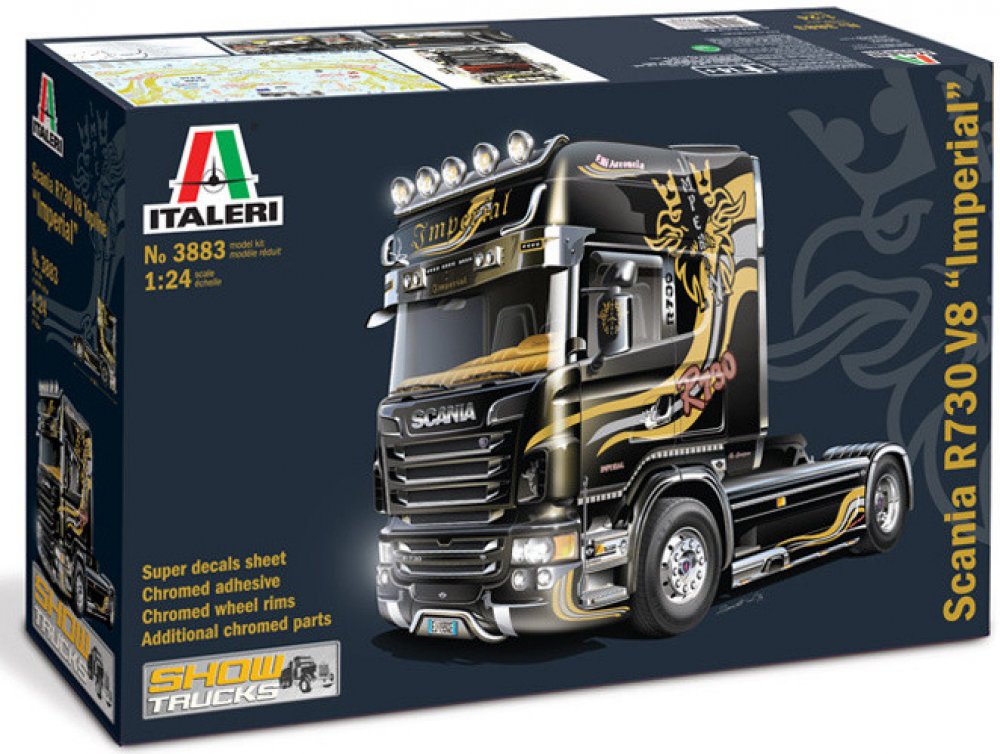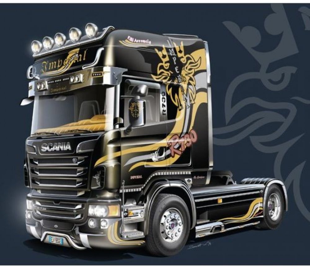 Model trucku ke slepení. Velikost: 1:24; 24,7 cm. Podrobný popis:Model trucku ke slepení. Velikost: 1:24; 24,7 cm.Informace o originálu:Těžké tahače Scania řady R jsou k dostání s motory V8 a byly vyvinuty na základě současných požadavků světového trhu. Tyto agregáty jsou postaveny tak, aby zvládly i ty nejtěžší úkoly, a obzvláště oceňována je jejich bytelnost, reaktivita a úspornost. Díky nim jsou vozy této řady připraveny splnit i ty nejnáročnější požadavky na spotřebu paliva a spolehlivost. Vzhled těchto strojů budí na silnici značně impozantní dojem a ne náhodou jsou považovány za jedničku na slavných akcích “SHOW TRUCKS”, na kterých se předvádějí vyšperkované tahače. Jejich výjimečná vizáž zároveň dobře ladí s exkluzivními novými interiéry, které posyktují řidiči vysokou úroveň pohodlí a zájemcům dávají na výběr z široké řady barev a materiálů. Kromě toho je navíc tento model dotažen k dokonalosti pomocí fantastických obtisků a „pokovených“ samolepek okamžitě připravených k použití. Balení dále obsahuje také nové plastové části imitující chrom, které modelu ještě přidávají na realistickém vzezření.Informace o modelu:ÚŽASNÉ SAMOLEPKY & ARCHY S OBTISKY – CHROMOVANÉ DOPLŇKY A RÁFKY KOL Barevné schéma (Doporučené barvy Italeri): - 4671AP, 4678AP, 4695APDetaily modelu:Měřítko: 1:24Délka: 247 mmObtížnost: 5Doporučeno pro děti od 14 let. Upozornění: Nebezpečí udušení! Výrobek obsahuje malé části. NEVHODNÉ PRO DĚTI DO 3 LET!