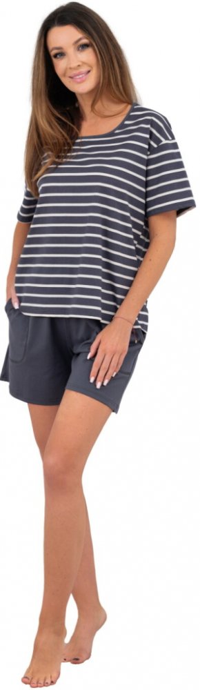 Materiál: 100% bavlnaVyrobeno z čisté, vysoce kvalitní bavlnyPruhovaný vzorSnížená linie rukávůKalhoty s elastickým pasem zdobeným saténovou mašlíKapsy na drobnostiVolný střihElegantní a klasické základní barvyIdeální jako domácí oblečeníGramáž úpletu je 140-150 g/m2Výrobek vyrobený v PolskuVýrobek šitý ve velikostech od S do 2XLModelka nosí velikost S