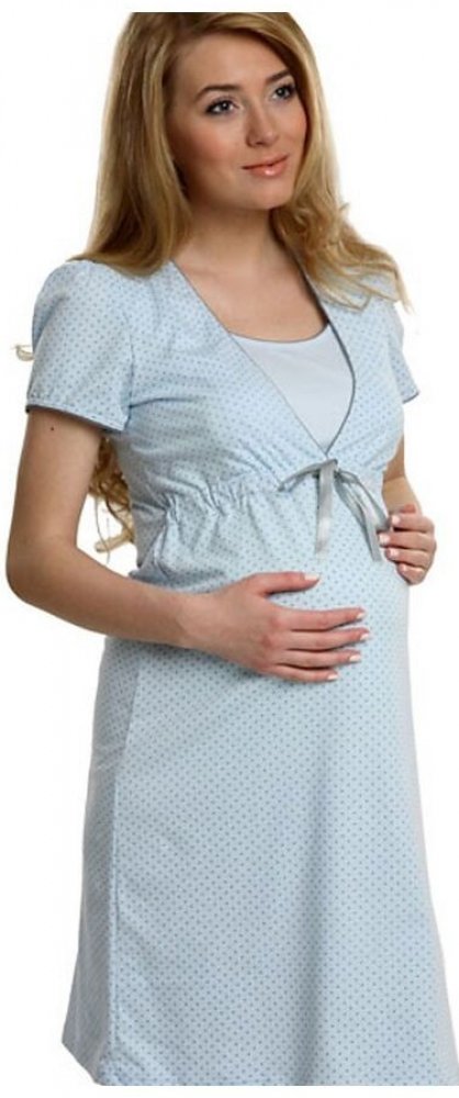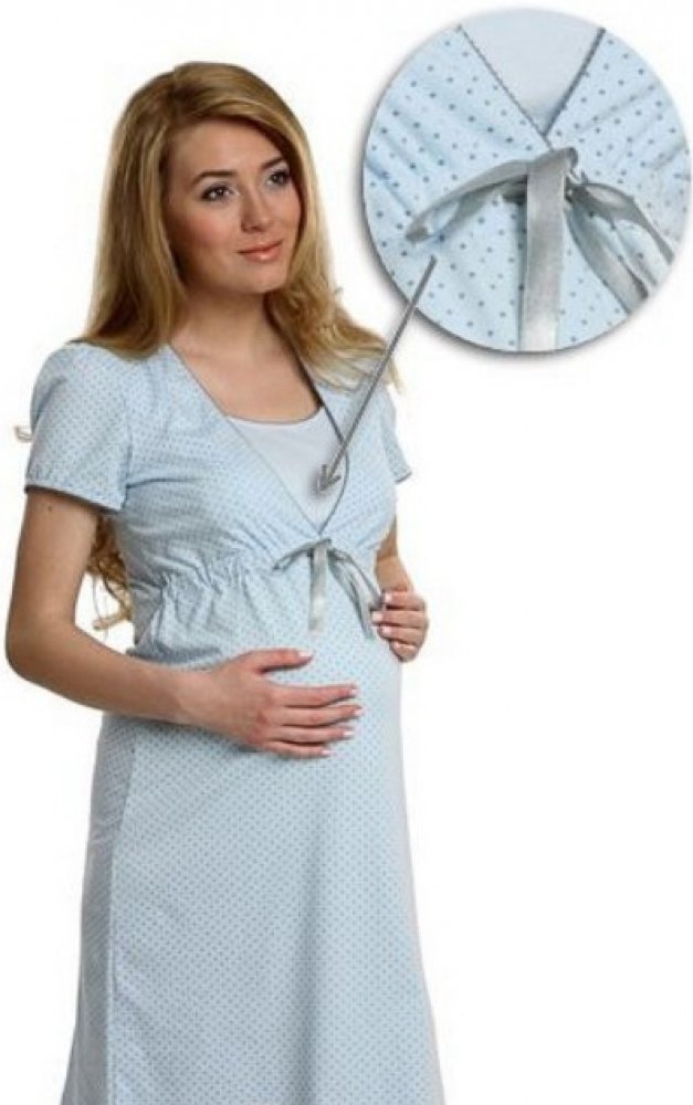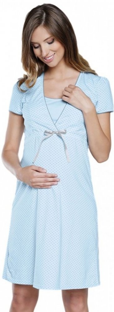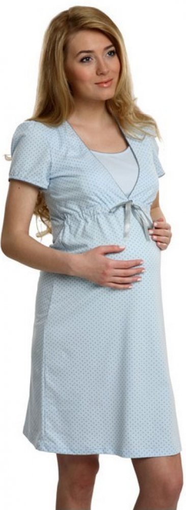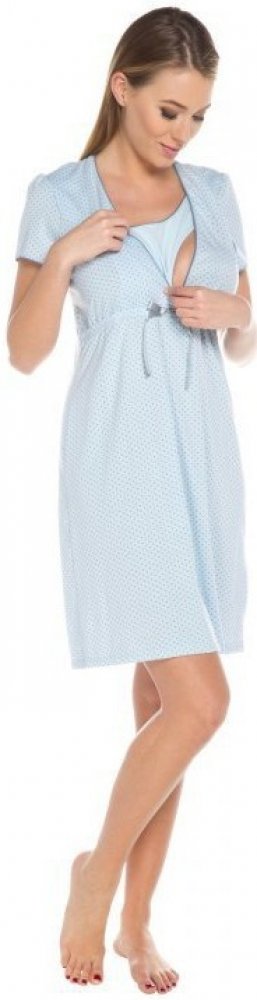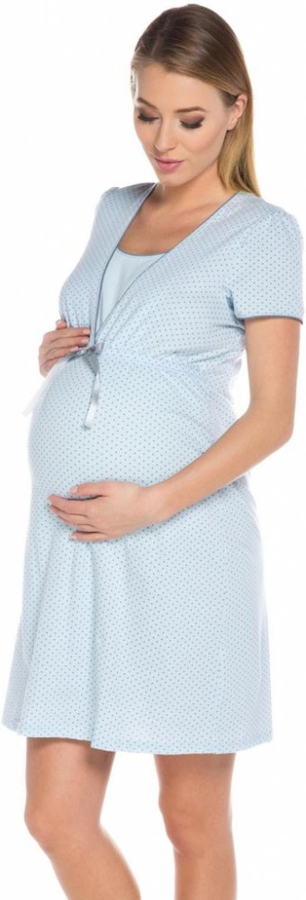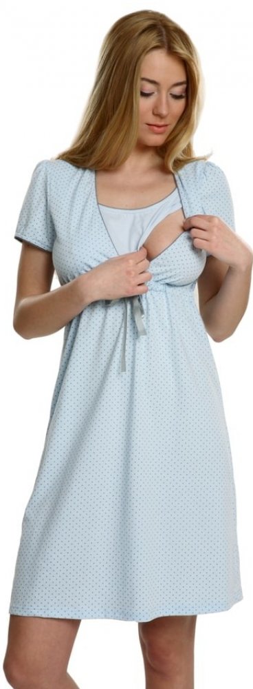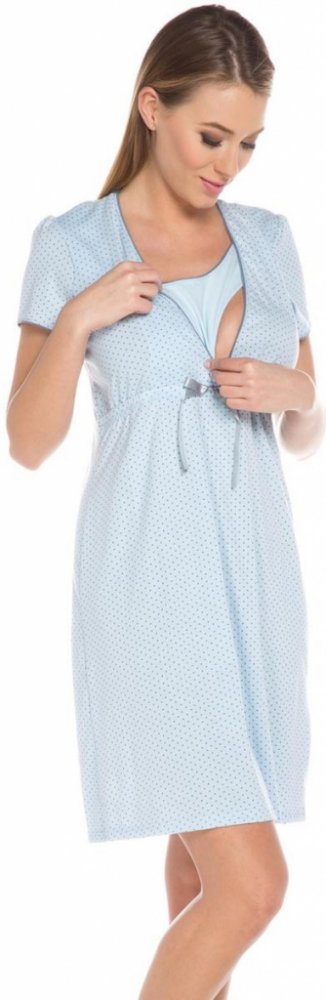 Pohodlná těhotenská a kojicí noční košile ve světle modré barvě. Noční košile je ve světle modré barvě s šedými puntíky. Pohodlná noční košile s krátkým rukávem a s výstřihem uzpůsobeným pro snadné kojení. Pod prsy je všitá gumička a ozdobná mašlička. Je vyrobena z kvalitní bavlny, velmi měkké, hebké a příjemné na dotek. K dispozici je také bavlněný župan Komfort vhodný jako komplet ke košilce. S ...