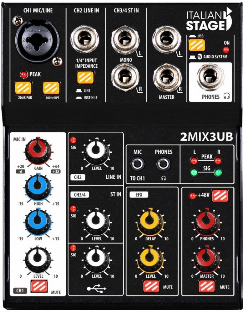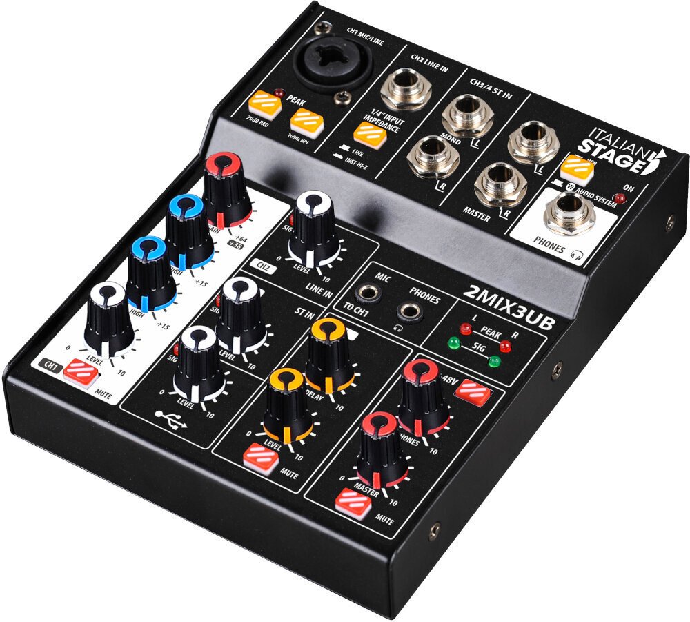 Analogový mixážní pult s 8 vstupními kanály. Digitální efektová jednotka, zabudovaný multimediální přehrávač, USB zvuková karta a Bluetooth pro bezdrátový přenos hudby. Mixážní pult nabízí 4x mikrofonní / linkový vstup, 2x stereo vstup / USB. Mikrofonní vstup poskytuje ovládání: GAIN, 3-pásmový EQ, PAD pro 26dB útlum, Phantomové napájení + 48V pro kondenzátorové mikrofony, stereo a USB vstup mají GAIN a 3-pásmový EQ. Digitální efektová jednotka nabízí celkem 16 efektů, které se dají přidat do jednotlivých vstupů přes EFX / SEND. Tahový Master Fader, výstup pro sluchátka a odposlech. Benefitem je zabudovaný multimediální přehrávač s displejem, který umožňuje nejen přehrávání hudby z USB vstupu a bezdrátové přes Bluetooth (z tabletu smartphonu), ale je možný i USB záznam. Cely záznam lze prostřednictvím zvukové karty s 2x vstup a 2x výstup přehrávat v PC nebo zpětně i přes mix pult. Nová Italian Stage 2MIX je série malých mixážních pultů, které nabízejí vše, co hudebníci nebo jednoduchý nadšenci potřebují, kvalitní zvuk díky použití nízkošumový předzesilovačů. Napájení: externí adaptér (který je součástí balení).