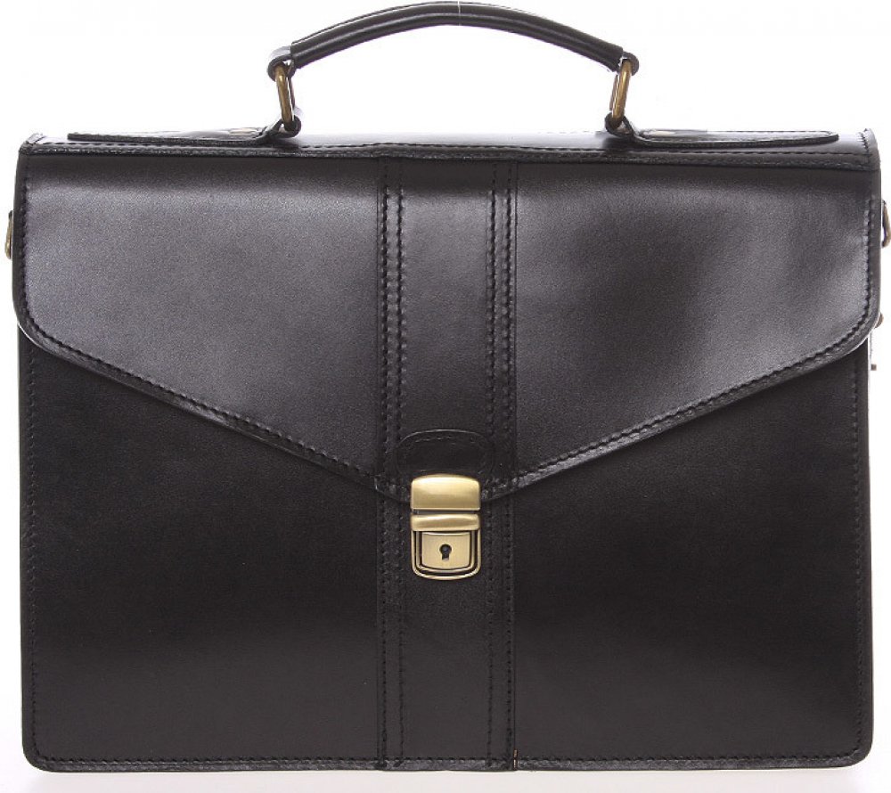 Černá business unisex kožená aktovka ItalY. Střední dvoufochová aktovka pro pány i dámy. Aktovka je středních rozměrů a lze ji použít i jako diplomatku nebo spisovku, do které se vejde notebook s maximálními rozměry 30 x 22 cm. Na přední straně je otevřená kapsa, do které se vleze rozměr A4. Zezadu je další kapsa na zip. Aktovka má odnímatelný kožený popruh pro nošení přes rameno. Novinka a bestse...