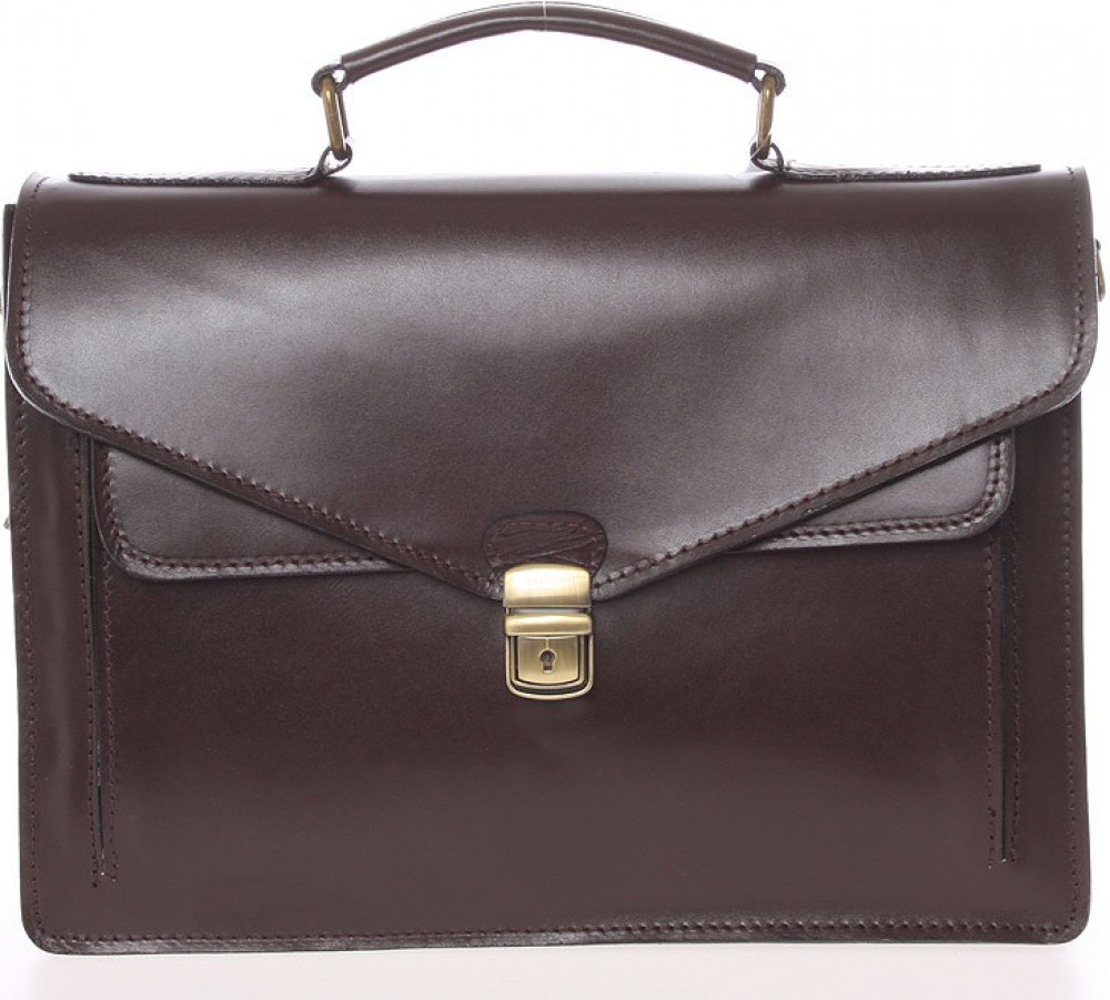 Luxusní unisexová tmavě hnědá kožená aktovka ItalY dvoufochová. Parádní kožená designová business aktovka pro pány i dámy se dvěma hlavními přihrádkami a přídavným popruhem. Aktovka není příliš velká a může sloužit i jako spisovka. Dovnitř se vleze notebook o max. rozměrech 30 x 21 cm. Na přední straně je výrazná kapsa s klopou bez zapínání. Novinka a bestseller 2018.