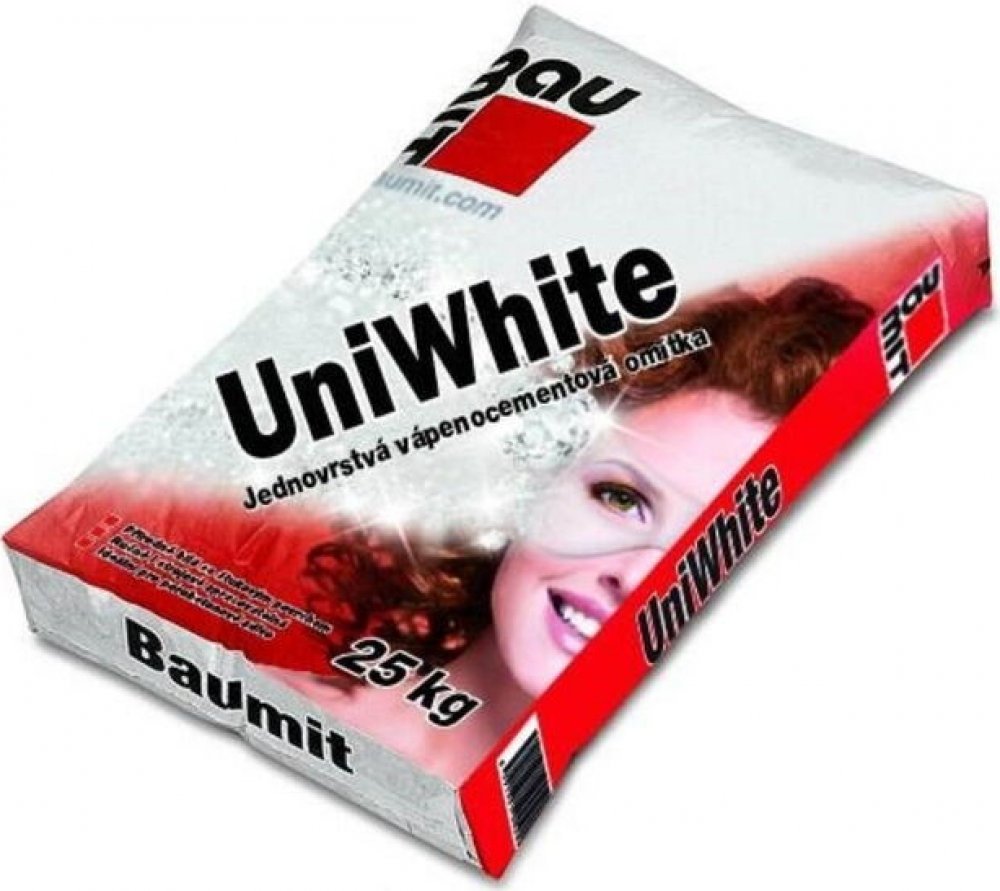 Jednovrstvá strojově i ručně zpracovatelná vápenocementová omítka s bílým cementem pro exteriéry i interiéry, vhodná zejména pro systémy přesného zdění. Ručně i strojově zpracovatelná, přírodně bílá, paropropustná, se schopností regulovat vzdušnou vlhkost v interiéru. Vlastnosti Velikost balení: 25 kg pytel Počet kusů na paletě: 54 Max. tloušťka: 20 mm v jednom pracovním kroku Min. tloušťka: 6 mm Spotřeba: cca 13,5 kg/m² Vydatnost: cca 1,8 m²/pytel Zrnitost: 0,6 mm Velikost palety: pytel 25 kg, 54 pytlů/ pal. = 1350 kg Výhody Jemná, silně hydrofobizovaná Jádro i štuk v jednom kroku Pro tloušťky již od 6 mm