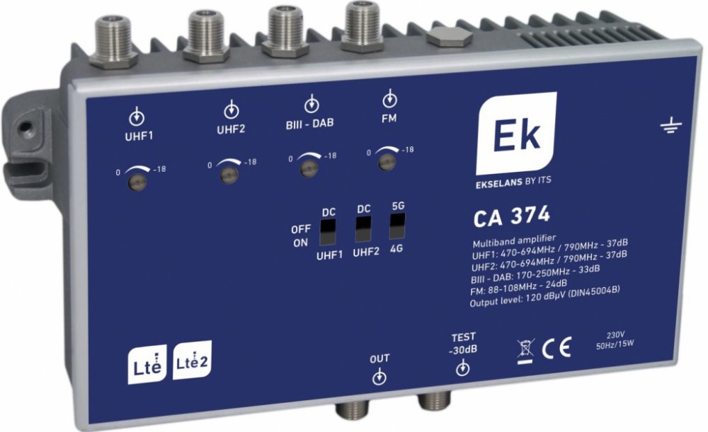Kompaktní výkonový širokopásmový zesilovač se 4 vstupy. UHF1 / UHF2 s volitelným dvojitým filtrem 694-790MHz. S přepínatelným předzesilovačem 12Vdc na vstupu UHF. Ideální pro zesílení signálu pozemního signálu pro střední a velkou kolektivní instalaci.