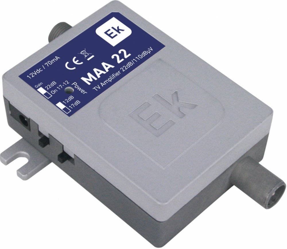 Vnitřní zesilovač s jedním vstupem a jedním výstupem. Lineární útlum v krocích po 5 dB. Montáž na stěnu. Velmi kompaktní design.