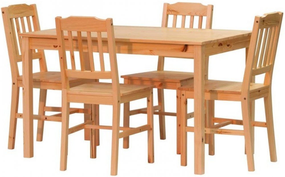 Jídelní sestava PINETA cílí na zákazníky, kteří touží po kvalitním nábytku do kuchyně za příznivou cenu. Stůl je lakovaný a vyrobený z masivu borovice, stejně tak kvarteto židlí, které k němu dokonale ladí.