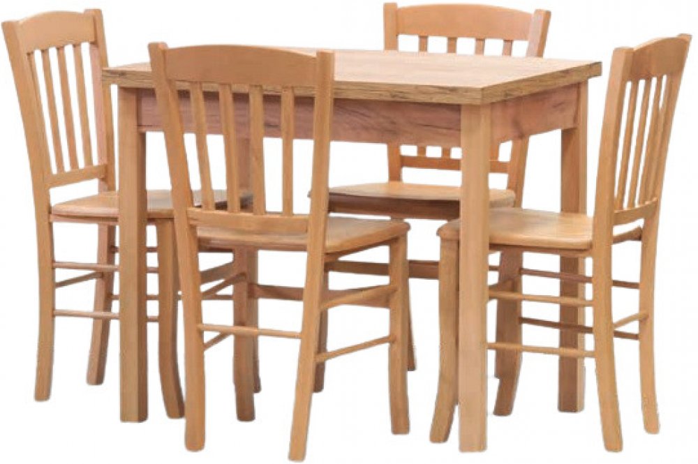 Jídelní set skládající se ze stolu Bingo 90 x 68 cm (rozkládací plocha + 68 cm) v moření Dub wotan a 4 židlí Veneta dub. Židle jsou z masivu, stůl má masivní nohy a desku z lamina. Set je vhodný do domácností i do zátěžových provozů jako jsou restaurační zařízení.
