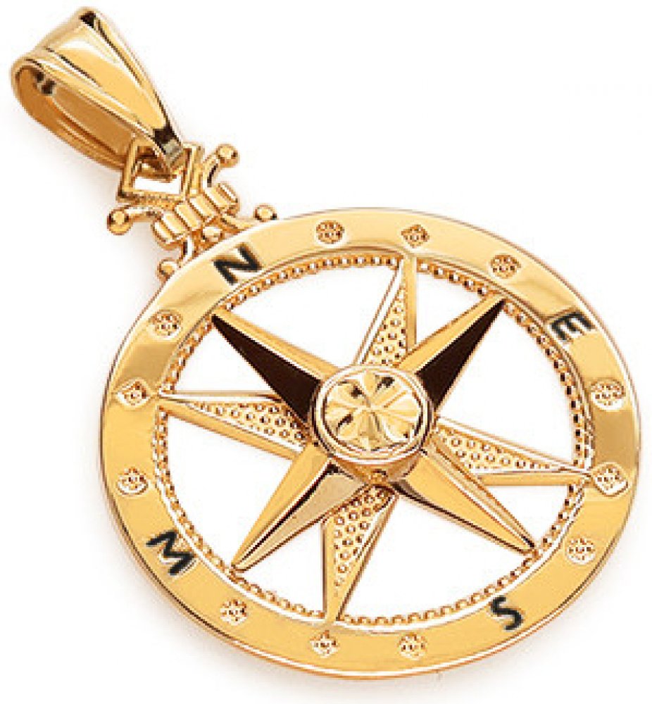Motiv kompasu je zpracován do přesného kruhu s kuličkovým lemem a středovým gravírem, který kreslí ostré světelné paprsky. Očko má vnitřní průměr 6 mm, pohodlně jím projde většina tenčích řetízků, povrch žlutého 14K zlata je zrcadlově leštěný a drží pravidelný obrys po celé ploše.