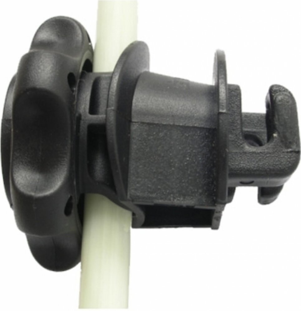 Průběžný izolátor pro vodivá lanka do 4mm a dráty určený k nasazení na tyč do 14mm.