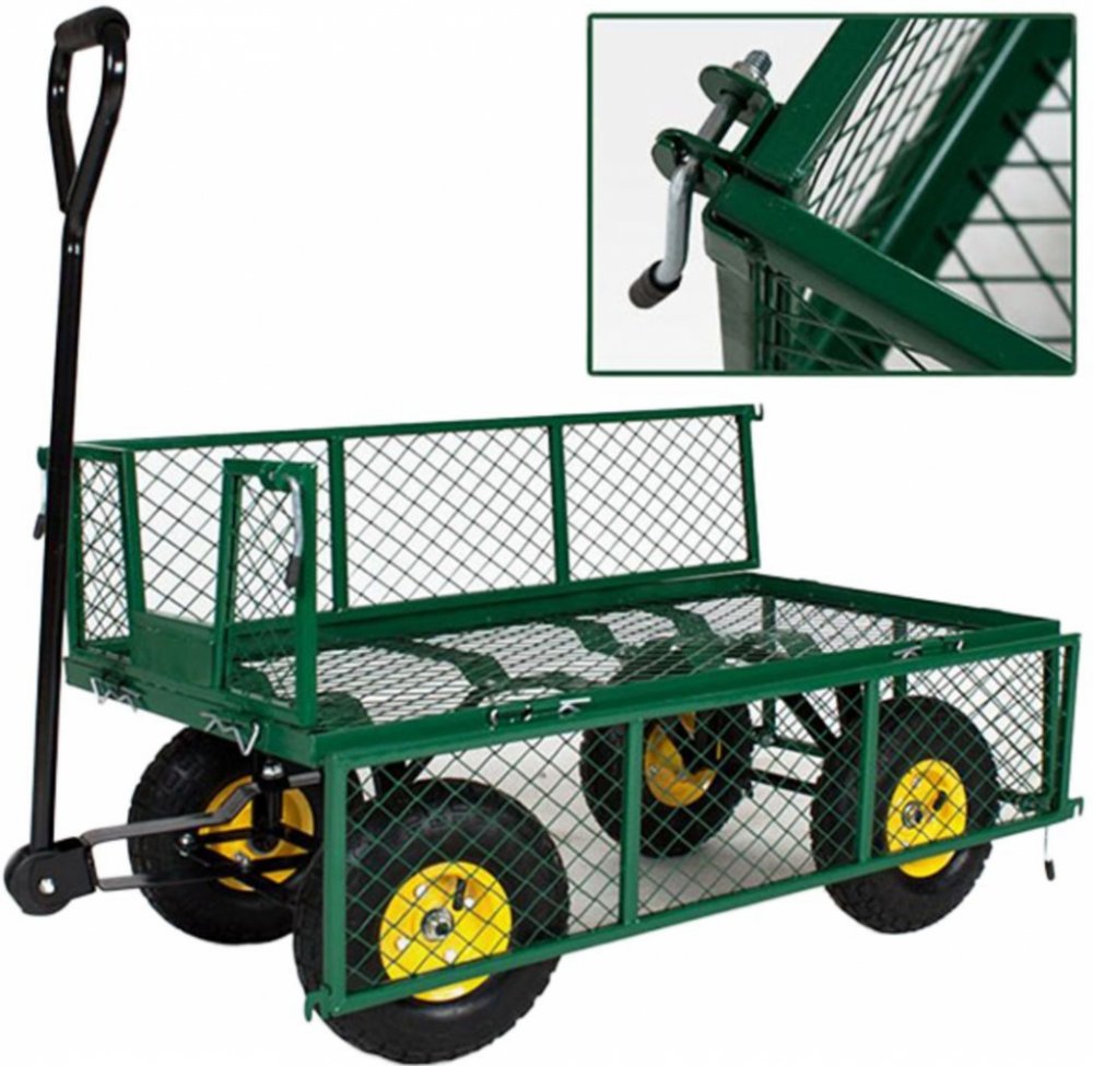 - Vozík čtyřkolový na 135 kg (300lb) s drátěnou korbou a sklápěcími bočnicemi.