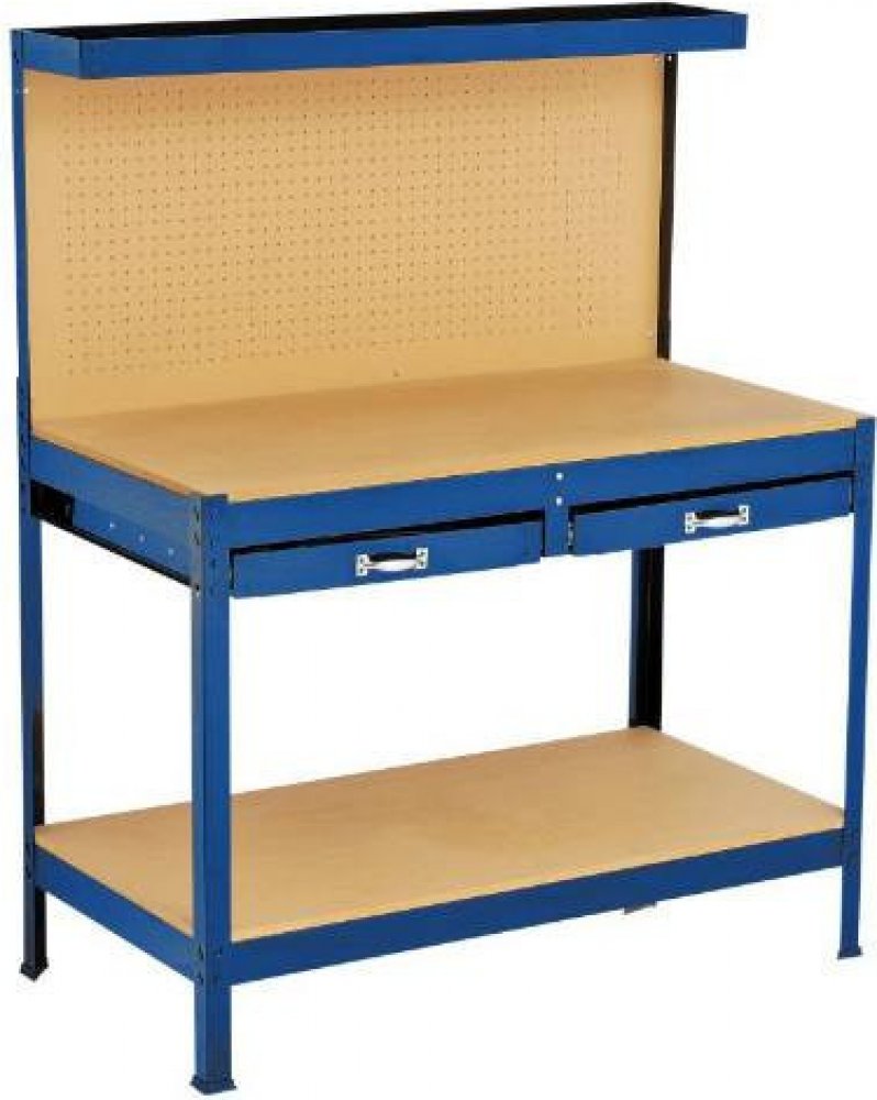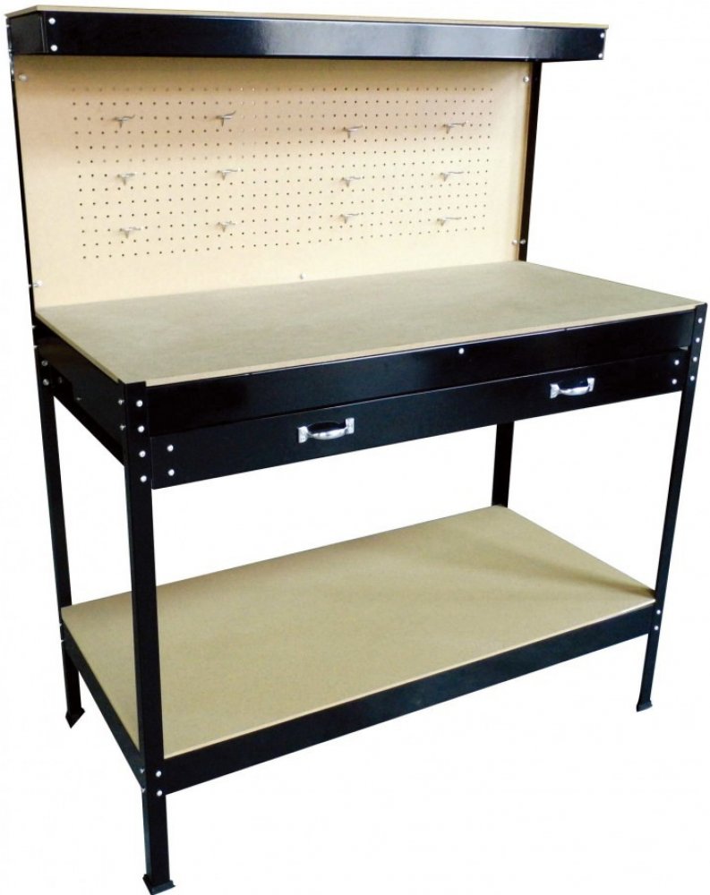 J.A.D. Tools 15610 Stůl pracovní dílenský 1200x600mm, 20 ks háků Kovový pevný pracovní stůl - vhodný do malých dílen, garáží či sklepů. Konstrukce rámu z kovového plechu s práškovým lakem proti korozi. Obsahuje dvě praktické zásuvky s vodícími lištami, lehký chod výsuvu, sololitová odolná pracovní deska i spodní odkládací deska, zadní stěna s otvory pro upevnění háčků a zavěšení nářadí s prakticko...