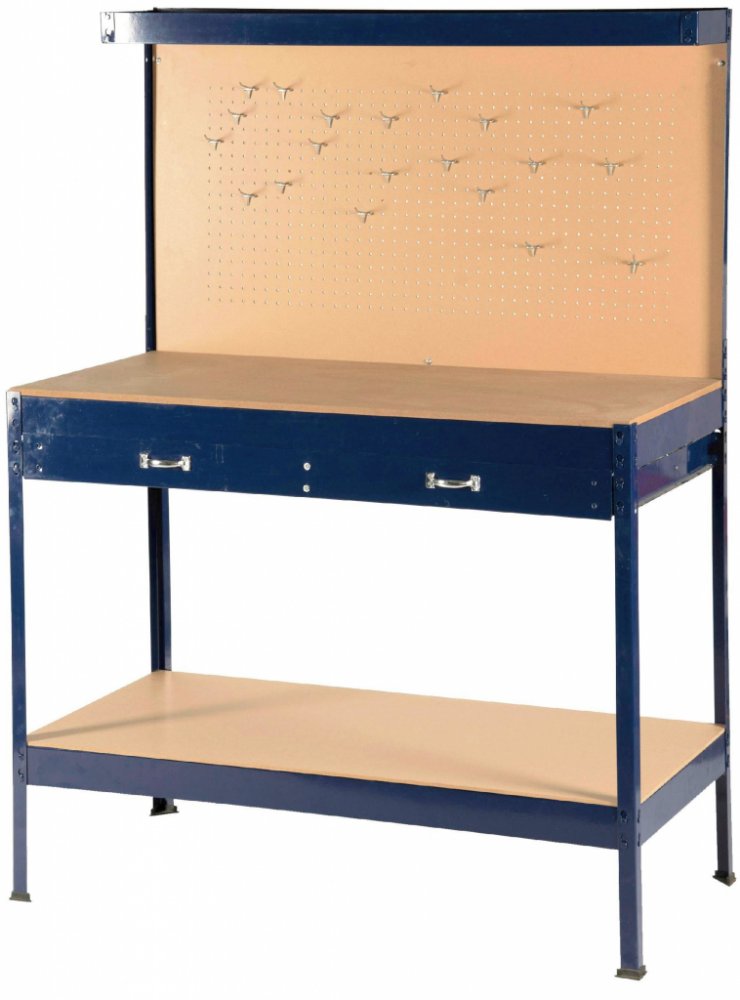 J.A.D. Tools 15610 Stůl pracovní dílenský 1200x600mm, 20 ks háků Kovový pevný pracovní stůl - vhodný do malých dílen, garáží či sklepů. Konstrukce rámu z kovového plechu s práškovým lakem proti korozi. Obsahuje dvě praktické zásuvky s vodícími lištami, lehký chod výsuvu, sololitová odolná pracovní deska i spodní odkládací deska, zadní stěna s otvory pro upevnění háčků a zavěšení nářadí s praktickou horní odkládací plochou. Součástí je i 20 ks háků na zavěšení nářadí. Rozměry: výška celková 150 cm výška pracovní desky 90 cm výška dolní odkládací plochy 50 cm šířka 120 cm hloubka 60 cm