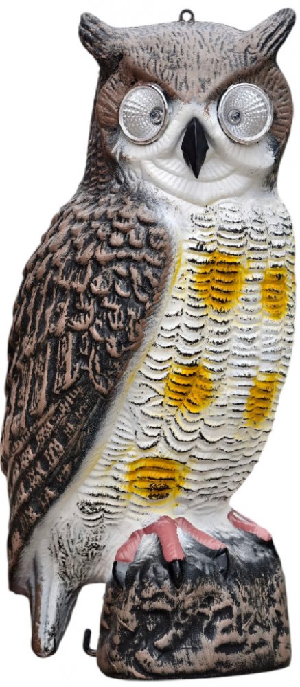 Dokonalý model dravého ptáka, v očích má umístěny žárovky solárně dobíjené. Účinně vystraší ptáky a hlodavce. Model sovy je vhodný pro zabezpečení a ochranu oblastí, jako jsou pole, sady, vinice.