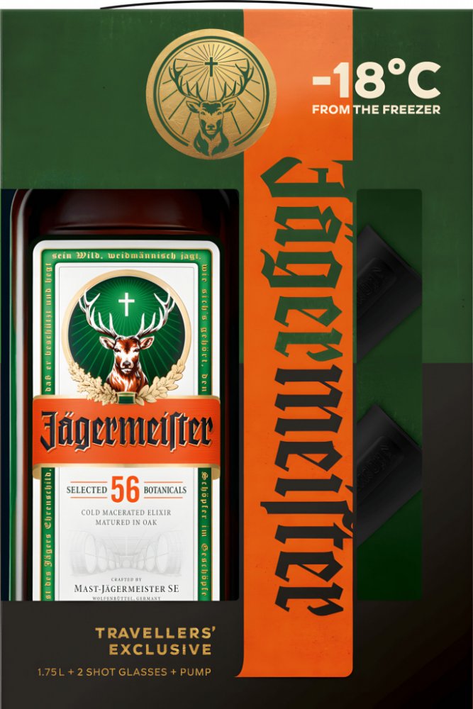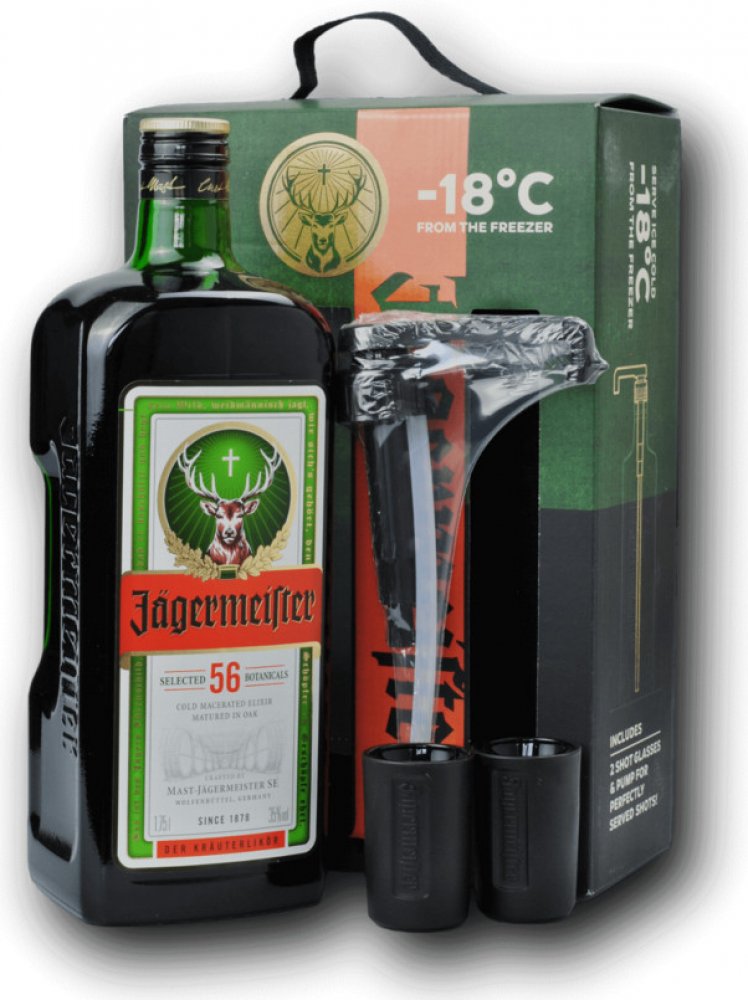 Jägermeister 35% 1,75 l (dárkové balení 2 sklenice + pumpa)
