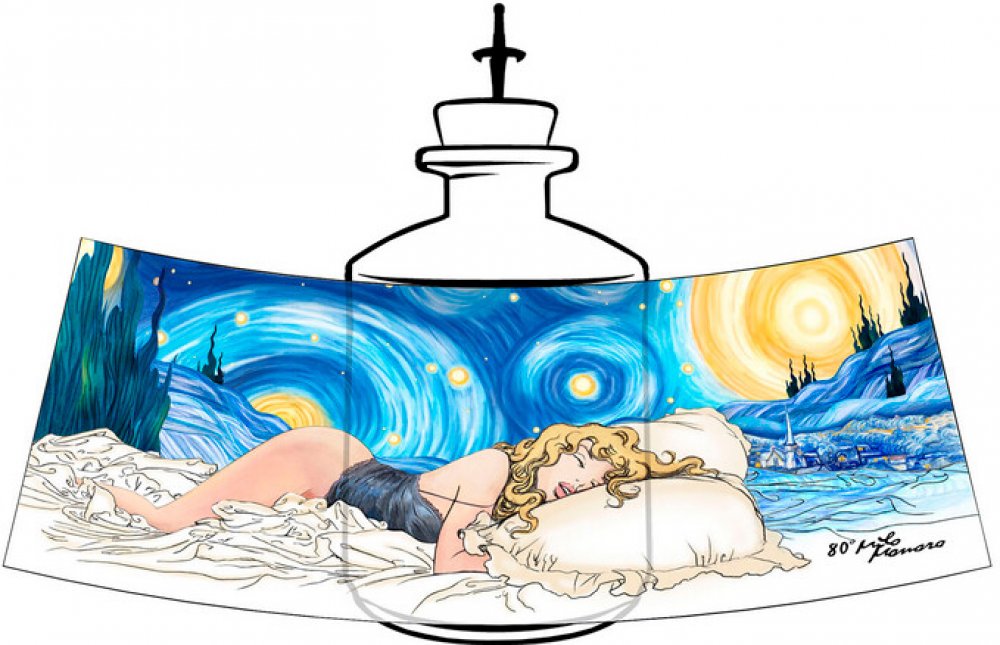 Autorem ilustrace lahve je Milo Manara, italský kreslíř a ilustrátor věnující se tvorbě historických a lechtivých komiksů.
