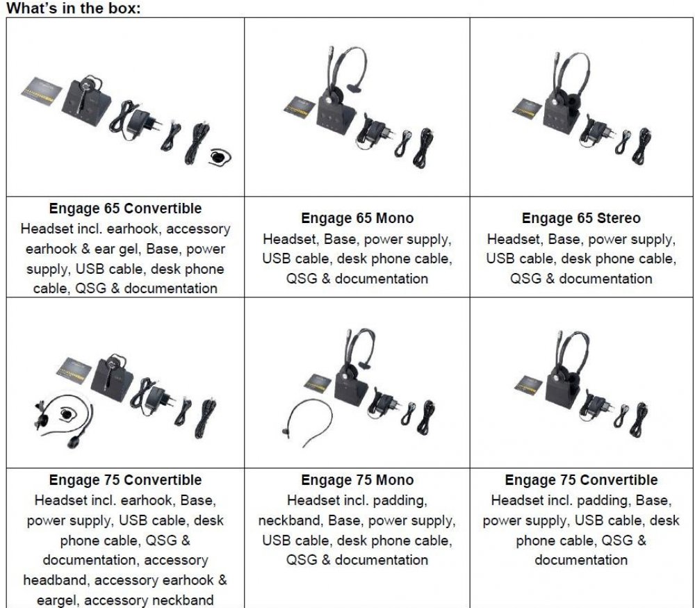 Náhlavní souprava, základna, napájecí adaptér, USB kabel, kabel pro stolní telefon, dokumentace, stručný návod