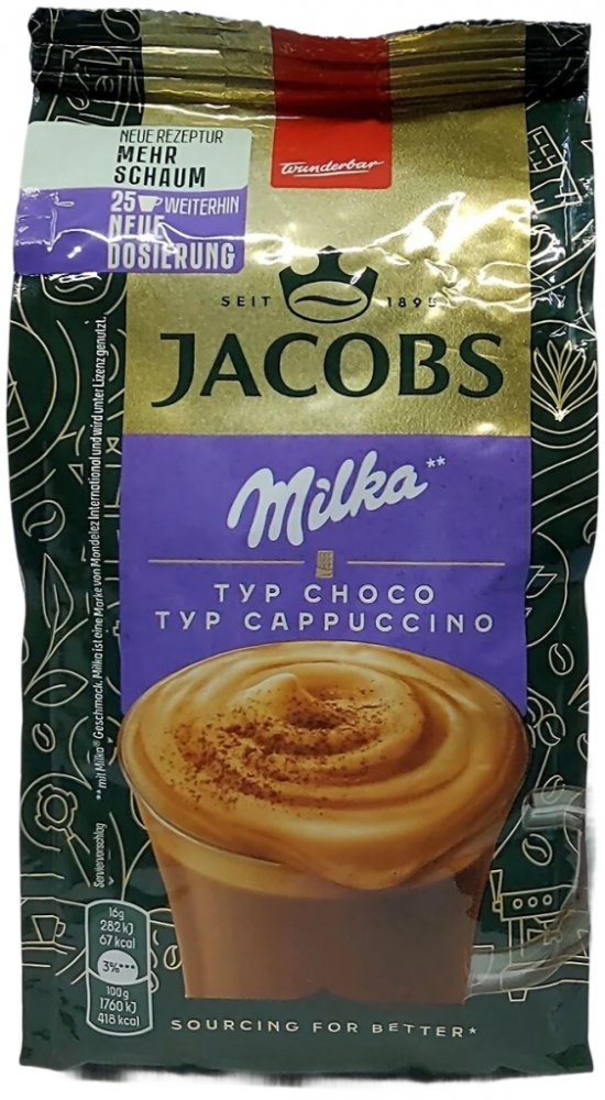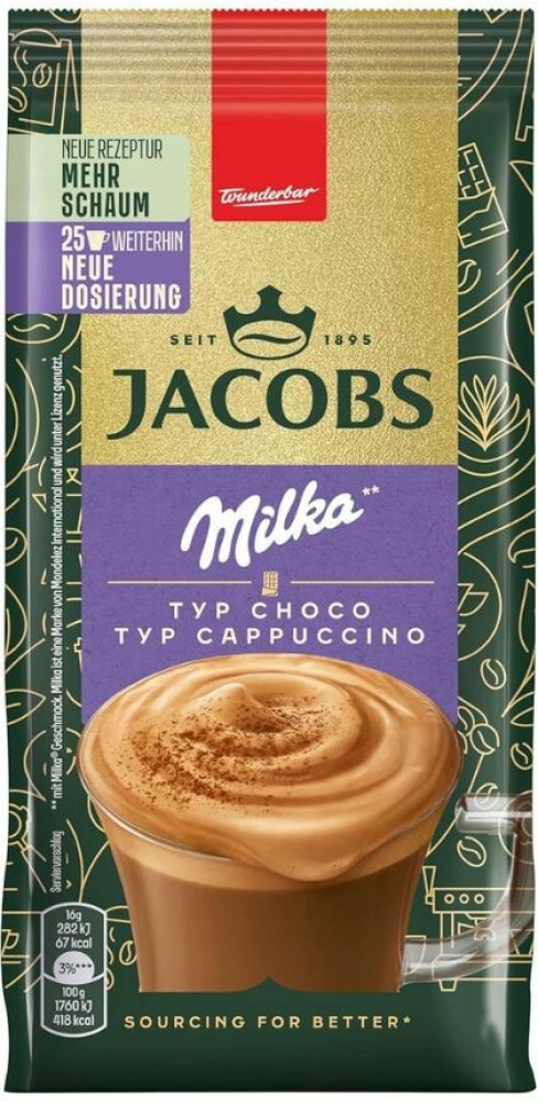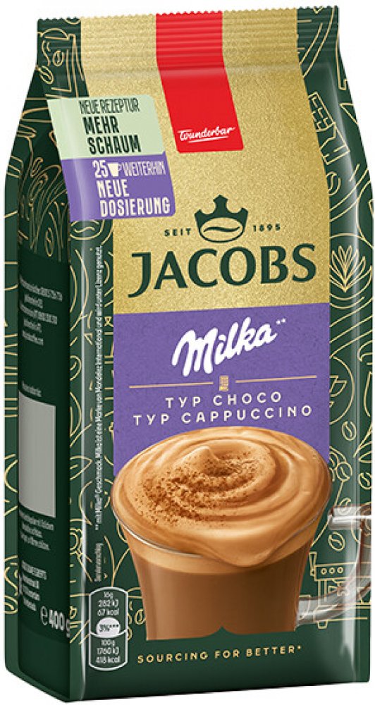 Jacobs Cappuccino Milka Choco instantní káva 400g přináší sladký chuťový zážitek, který harmonicky spojuje vůni kávy a jemnou