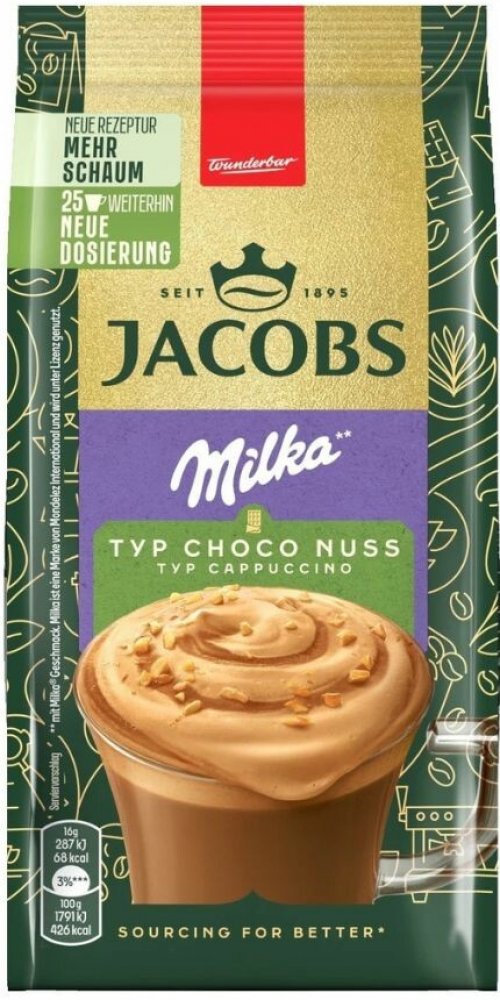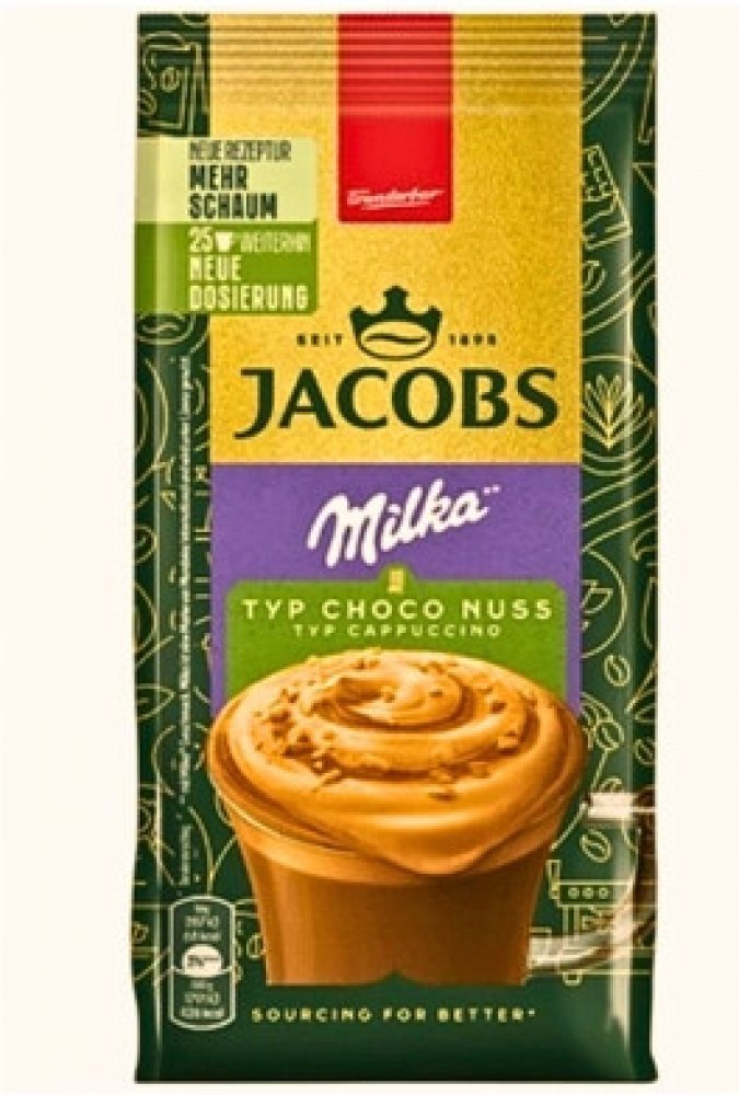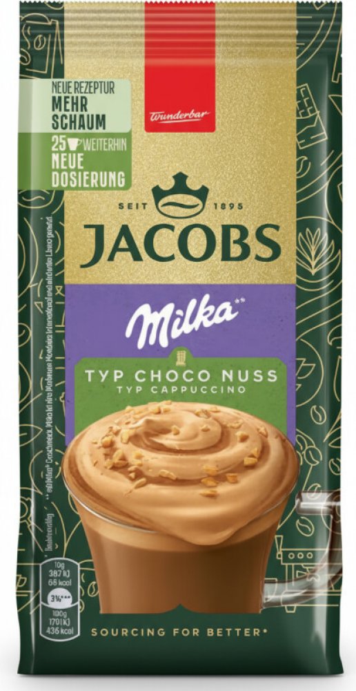 Pro milovníky Jacobs Choco Cappuccino s čokoládovou příchutí. Užijte si svůdnou kompozici kávy Jacobs, s nádachem čokolády Milka