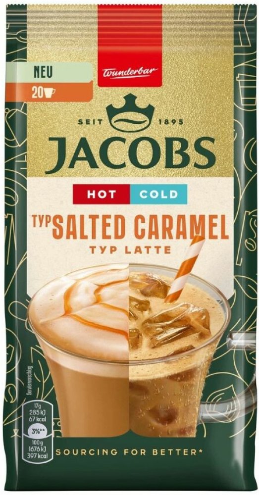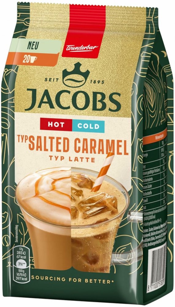 Jacobs Hot&Cold Salted Caramel instantní káva je ideální pro ty, kteří si chtějí dopřát variabilitu přípravy. Sametová latte pěna a